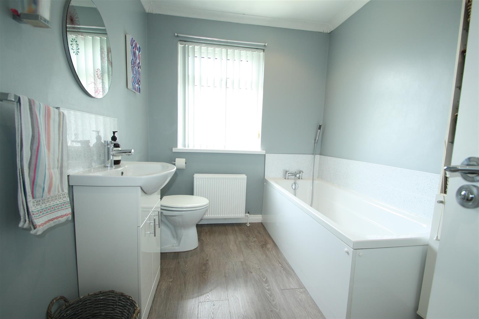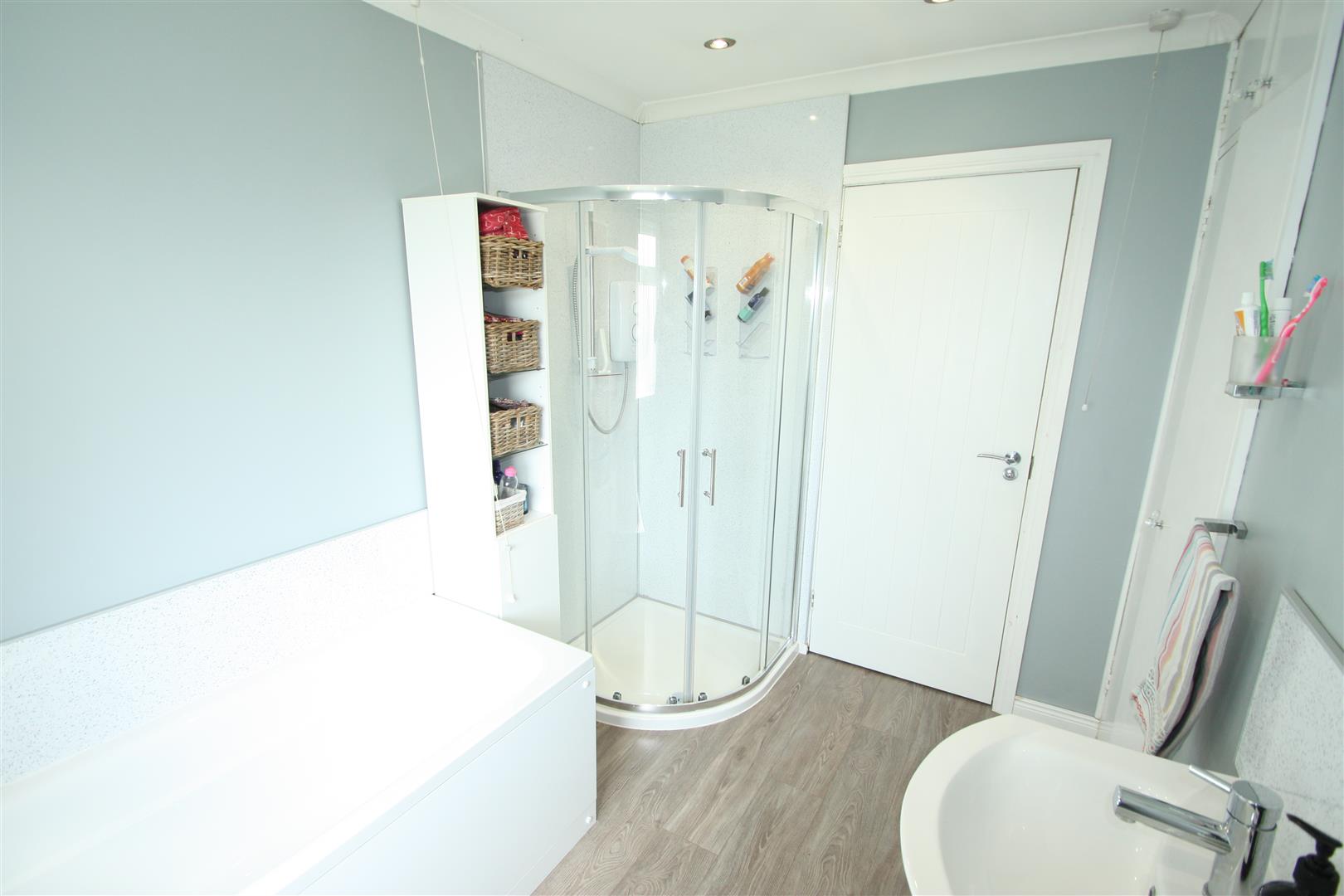 Family bathroom with white suite comprising panelled bath, vanity wash hand unit, low flush wc, quadrant shower enclosure with electric shower. Hotpress.