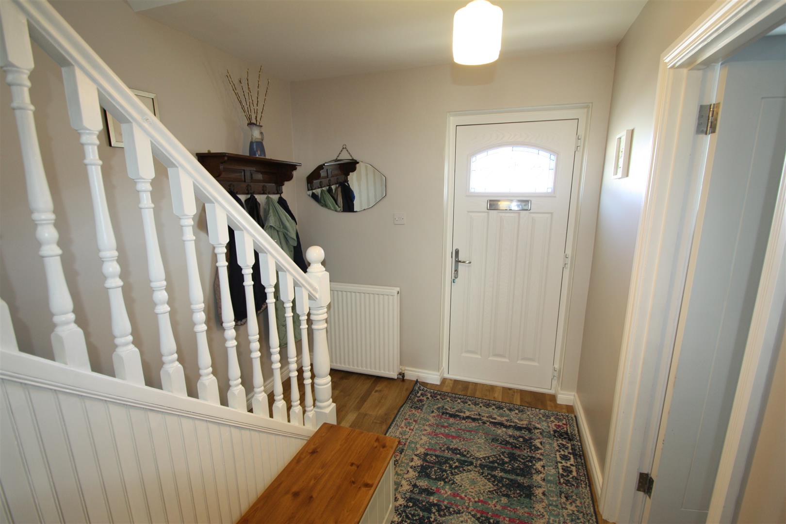 Composite door with stained glass leading to entrance hall, wood flooring, stairs to first floor.