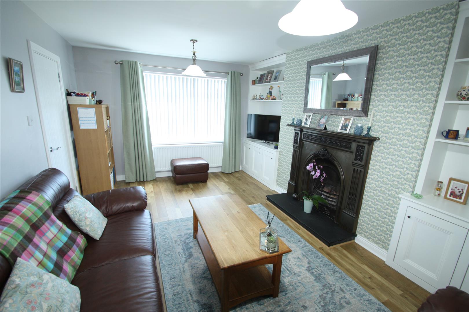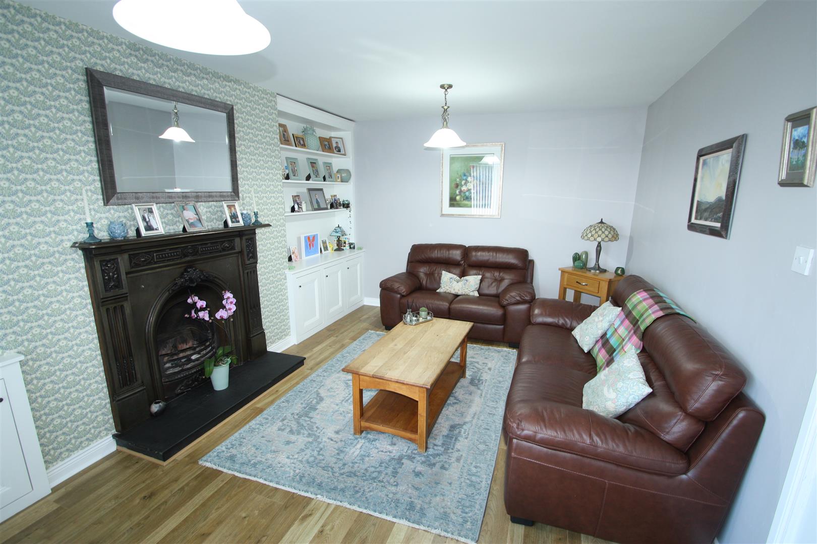 Living room with feature cast iron fireplace with open fire, granite hearth, built in display and storage units, wood flooring.