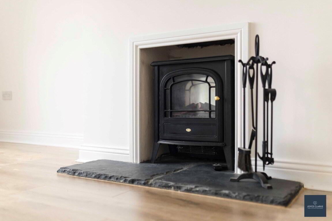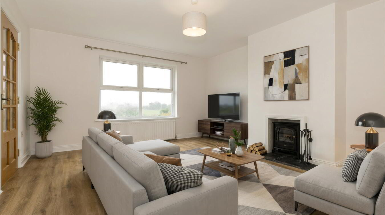 Front aspect reception room with views towards Mourne Mountains. Fireplace with electric stove insert. Double panel and single panel radiators. Wood effect laminate flooring.