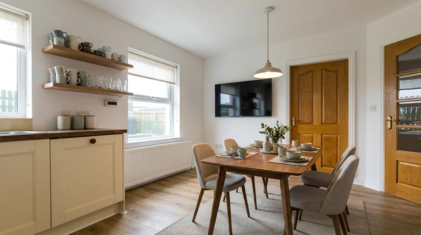 Range of low level units and larder style unit. Stainless steel sink and drainage unit. Space for washing machine and tumble dryer. UPVC door with glazed panels giving access to rear garden. Double panel radiator. Extractor fan.