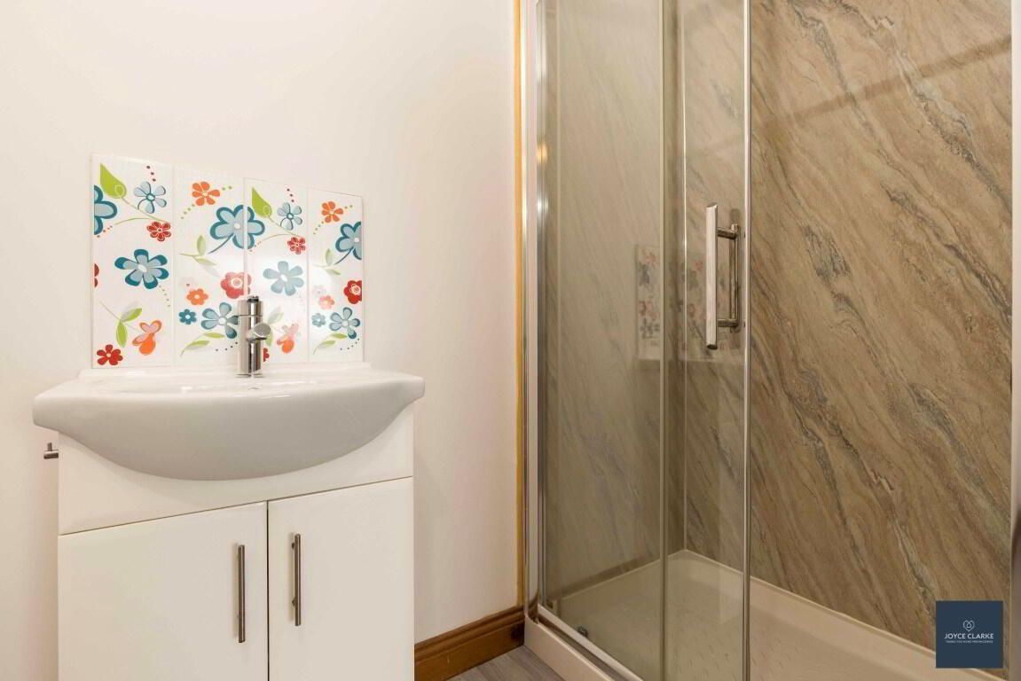 Panelled shower enclosure with mains fed shower, dual flush WC and wash hand basin with tiled splashback and vanity unit below. Single panel radiator. Extractor fan. Wood effect vinyl flooring.