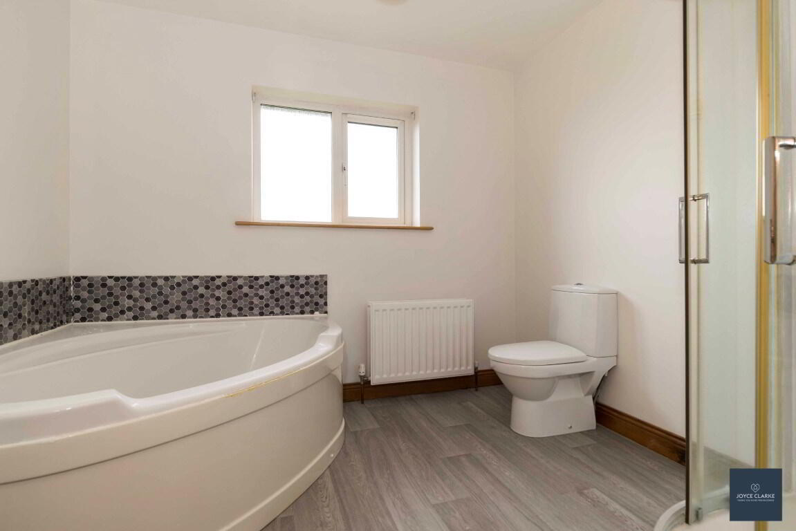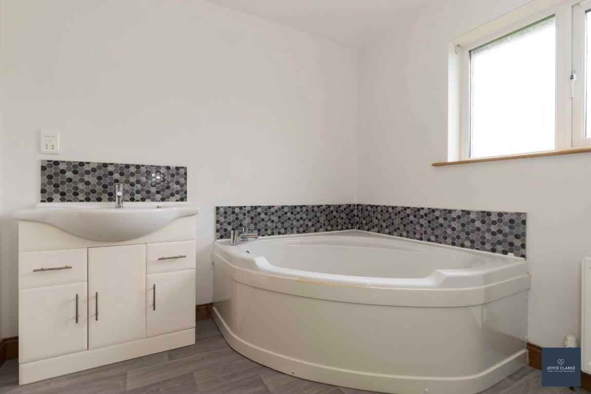 Four piece bathroom suite comprising large corner bath with tiled splashback, wash hand basin with tiled splashback and vanity unit below, dual flush WC and separate shower quadrant with PVC panelling and mains fed shower. Dual panel radiator. Extractor fan. Wood effect vinyl flooring.