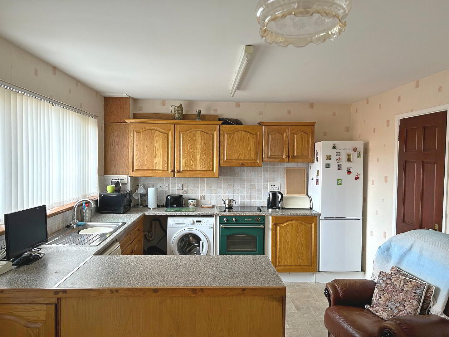 Fully fitted with a range of both high and low oak style shaker units with matching worktops and tiled back splash