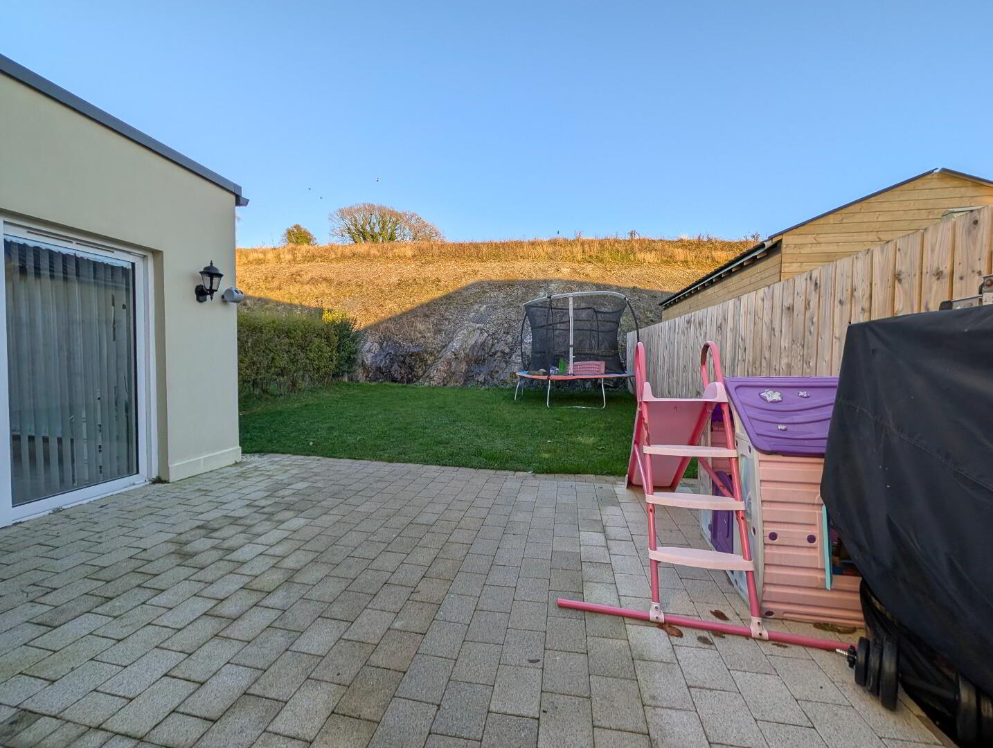 Rear - Enclosed garden with granite paved patio area and contrasting kerb surround, manicured lawn