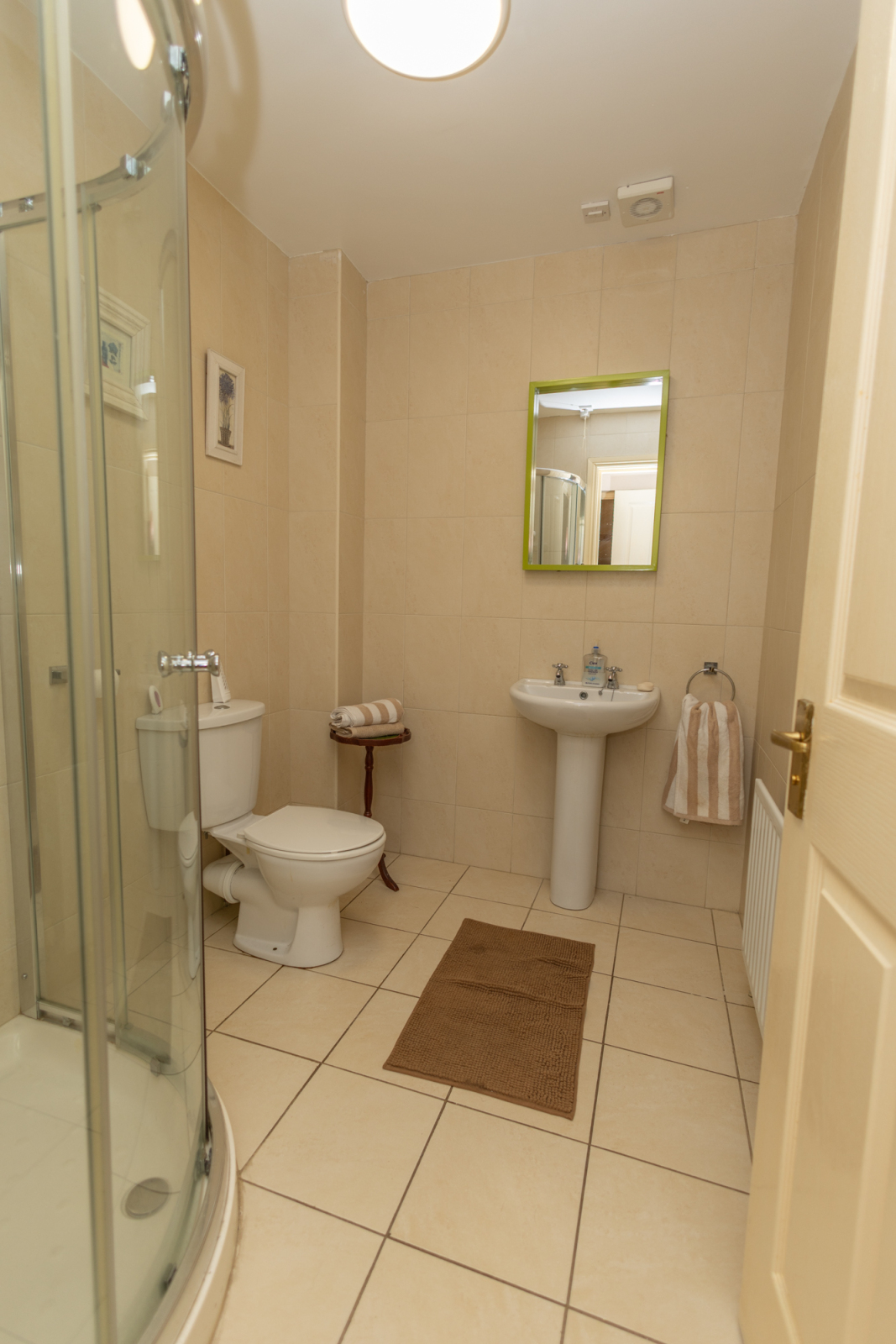 Fully tiled walls and flooring. White suite with WC and Wash hand basin with wall mounted mirror above.