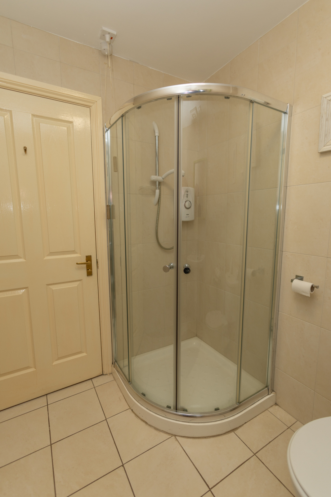 Corner mains shower with glass surround.