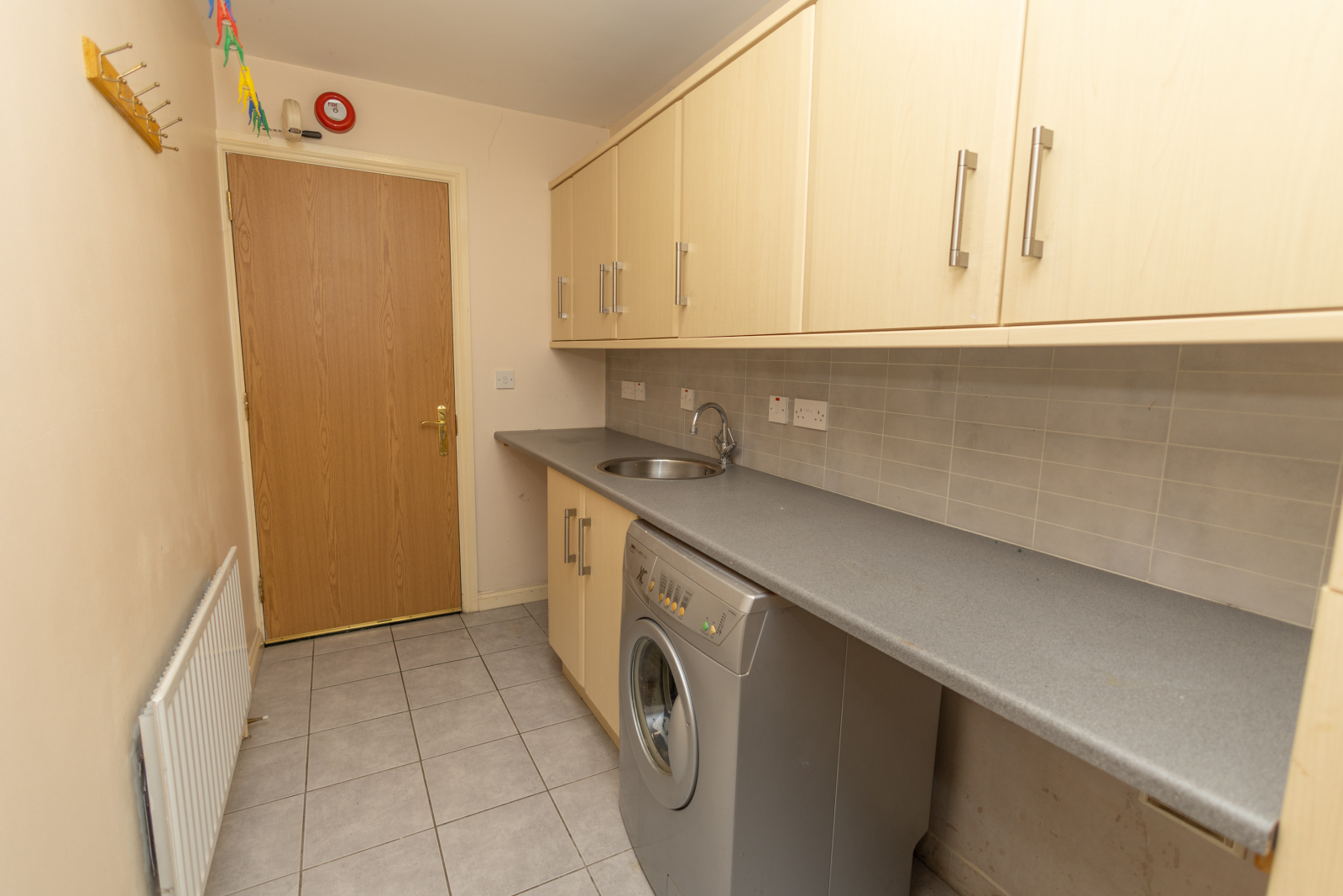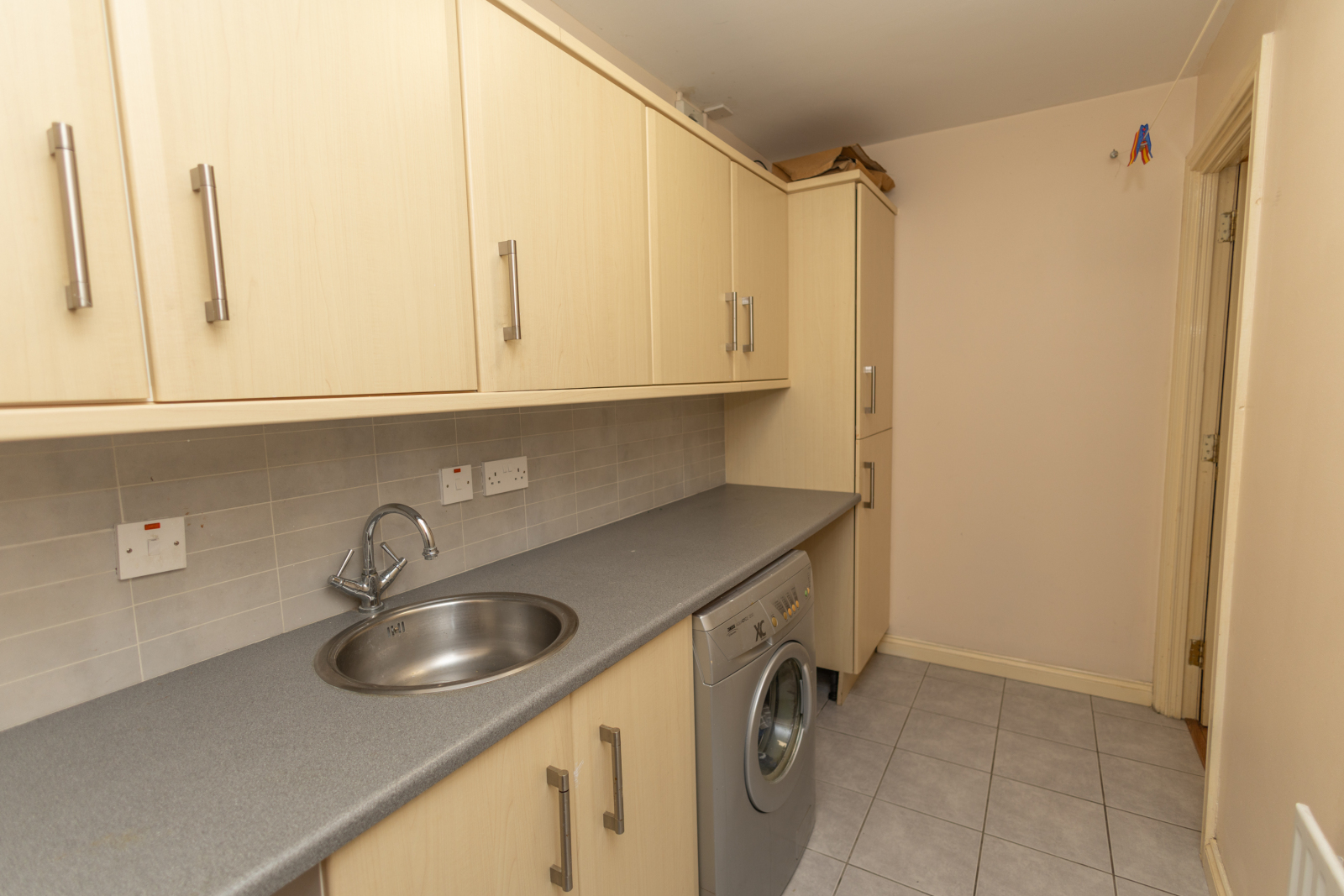 Space for washing machine and tumbler dryer. One bowl stainless steel sink.