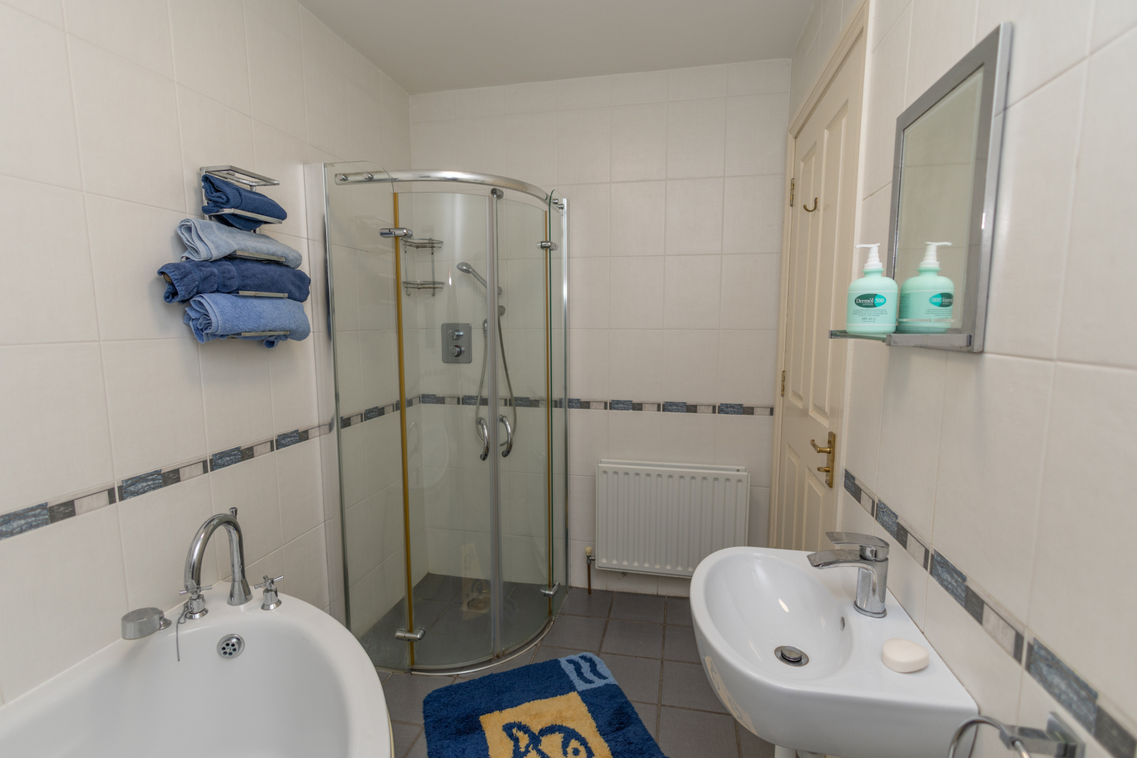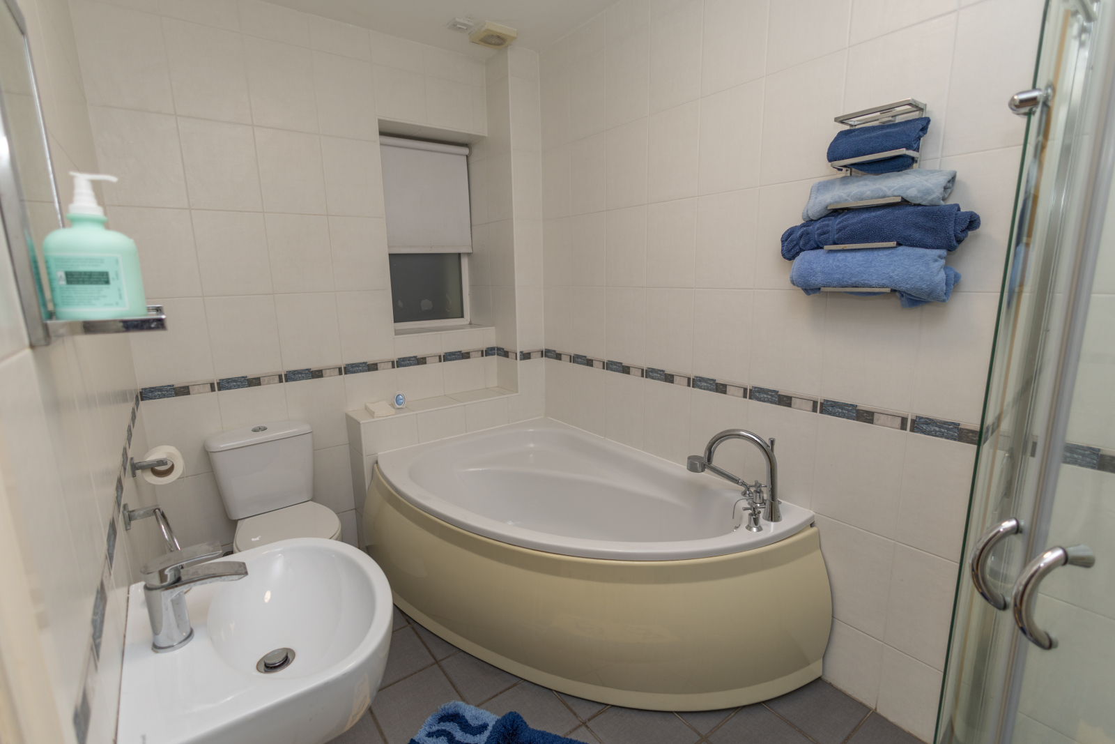 Corner panelled bath and corner mains shower with glass surround.