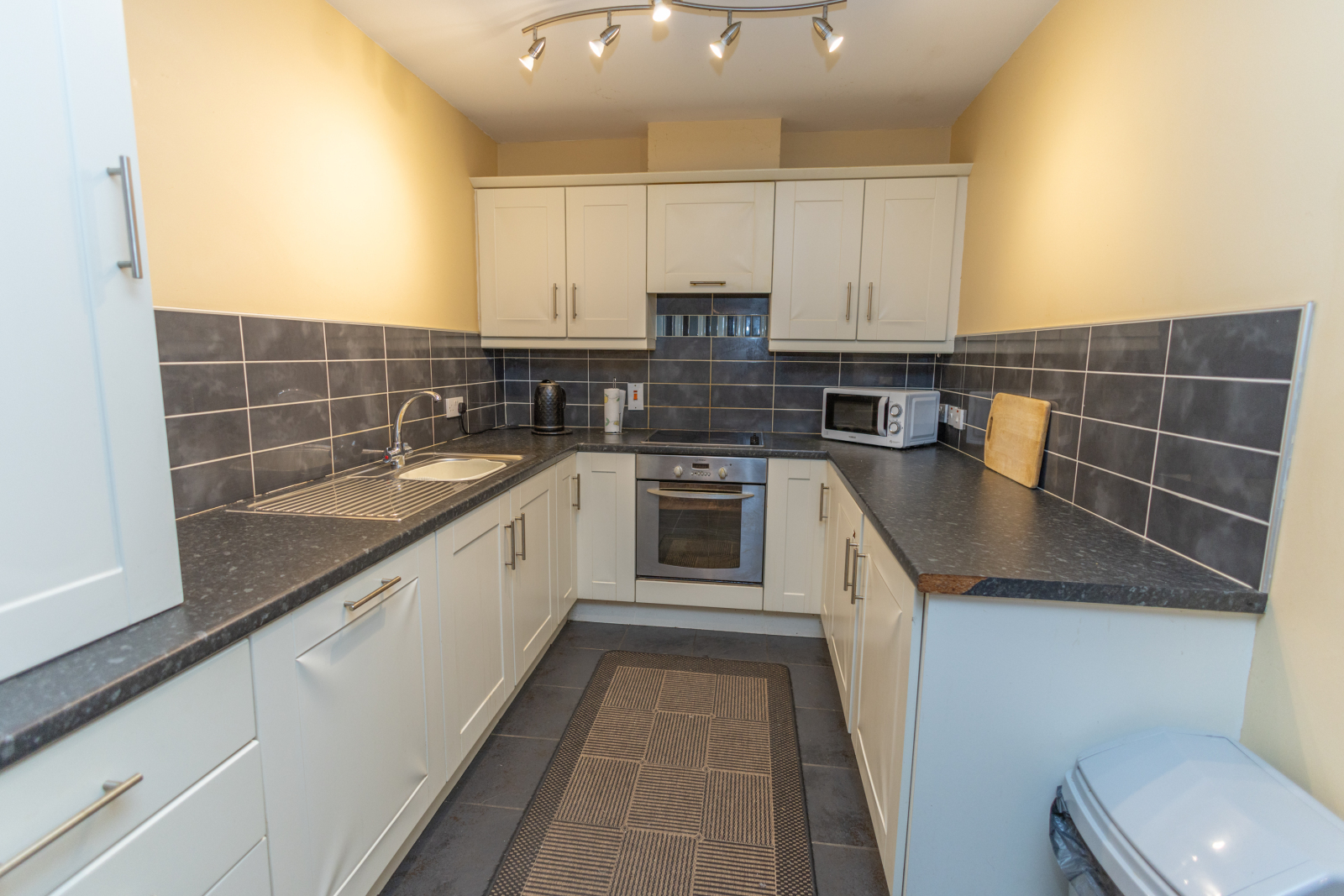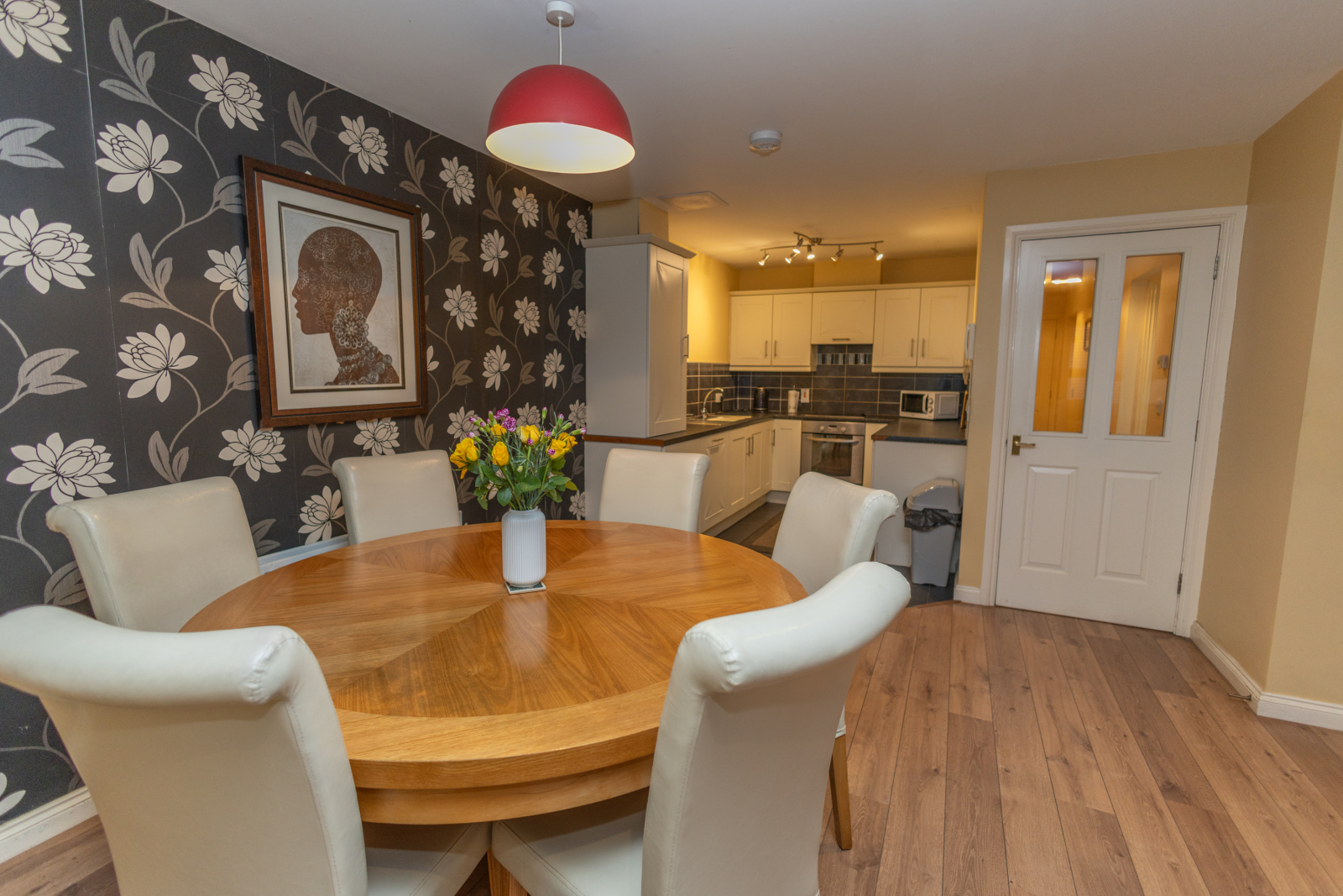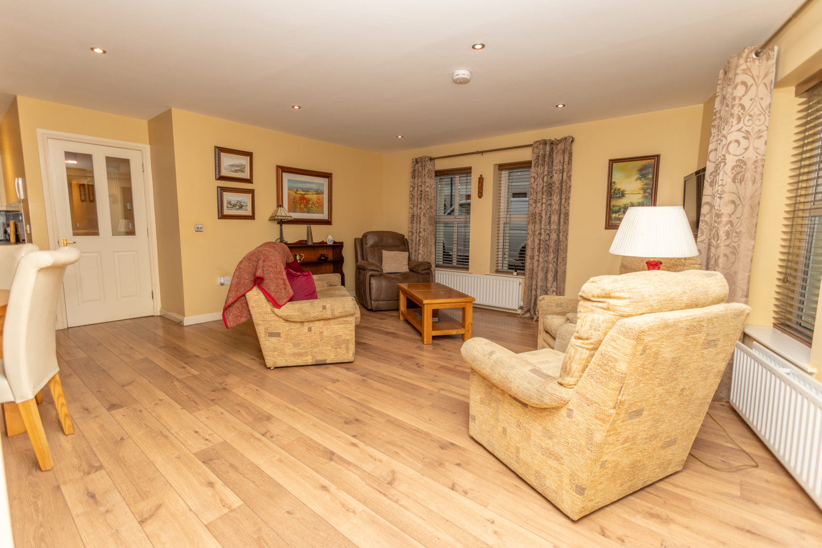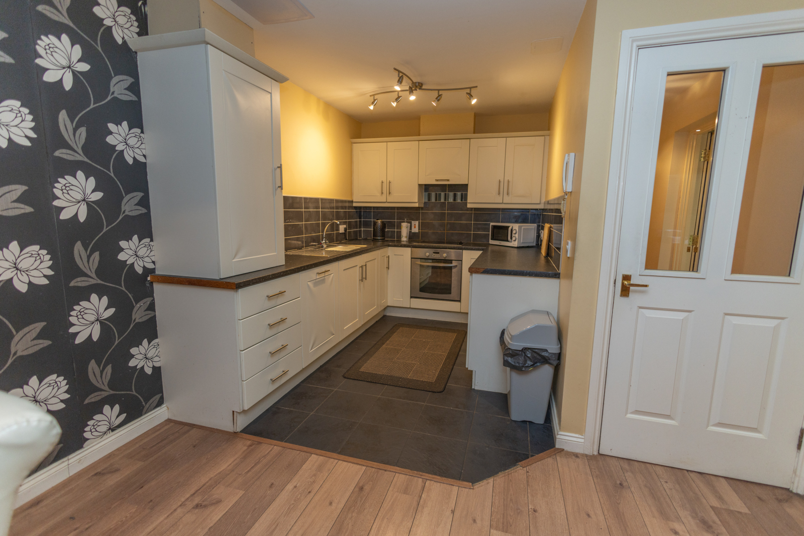 Bright, spacious open plan design. Laminate flooring to living areas and tiled flooring to kitchen area. Kitchen finished with upper and lower units, tiled between. Integrated appliances include dishwasher, electric hob and oven with extractor hood above. One bowl stainless steel sink and drainer. Cupboard in kitchen houses gas boiler.