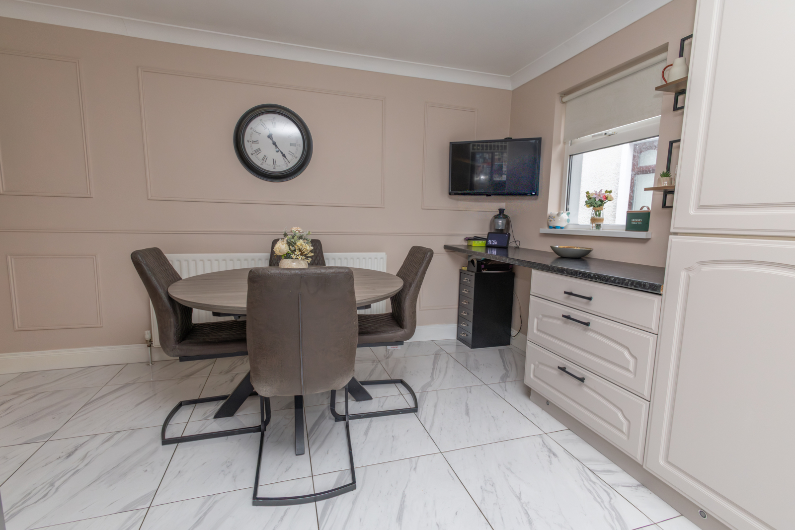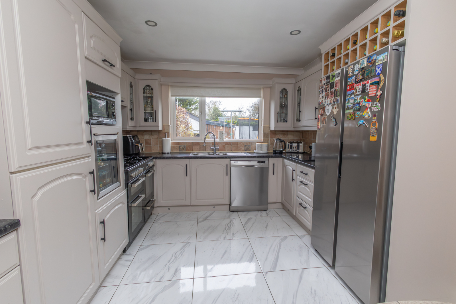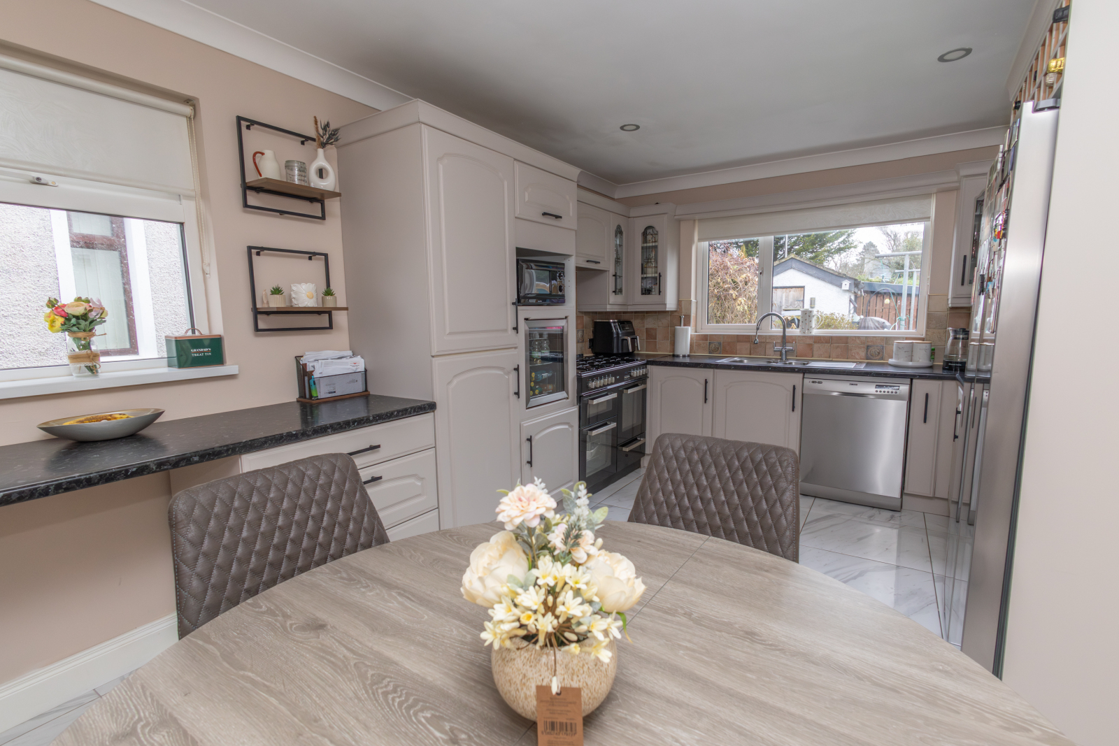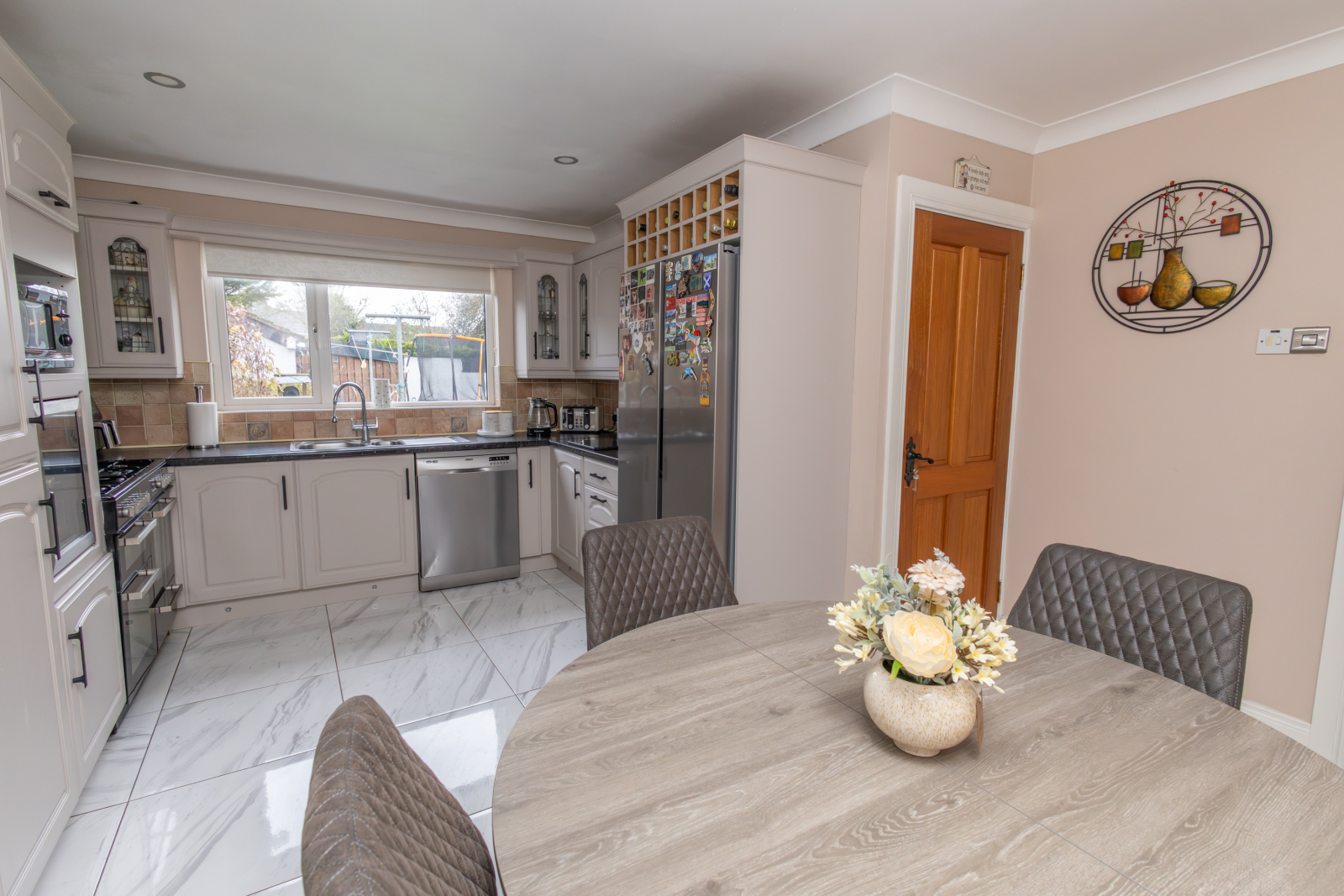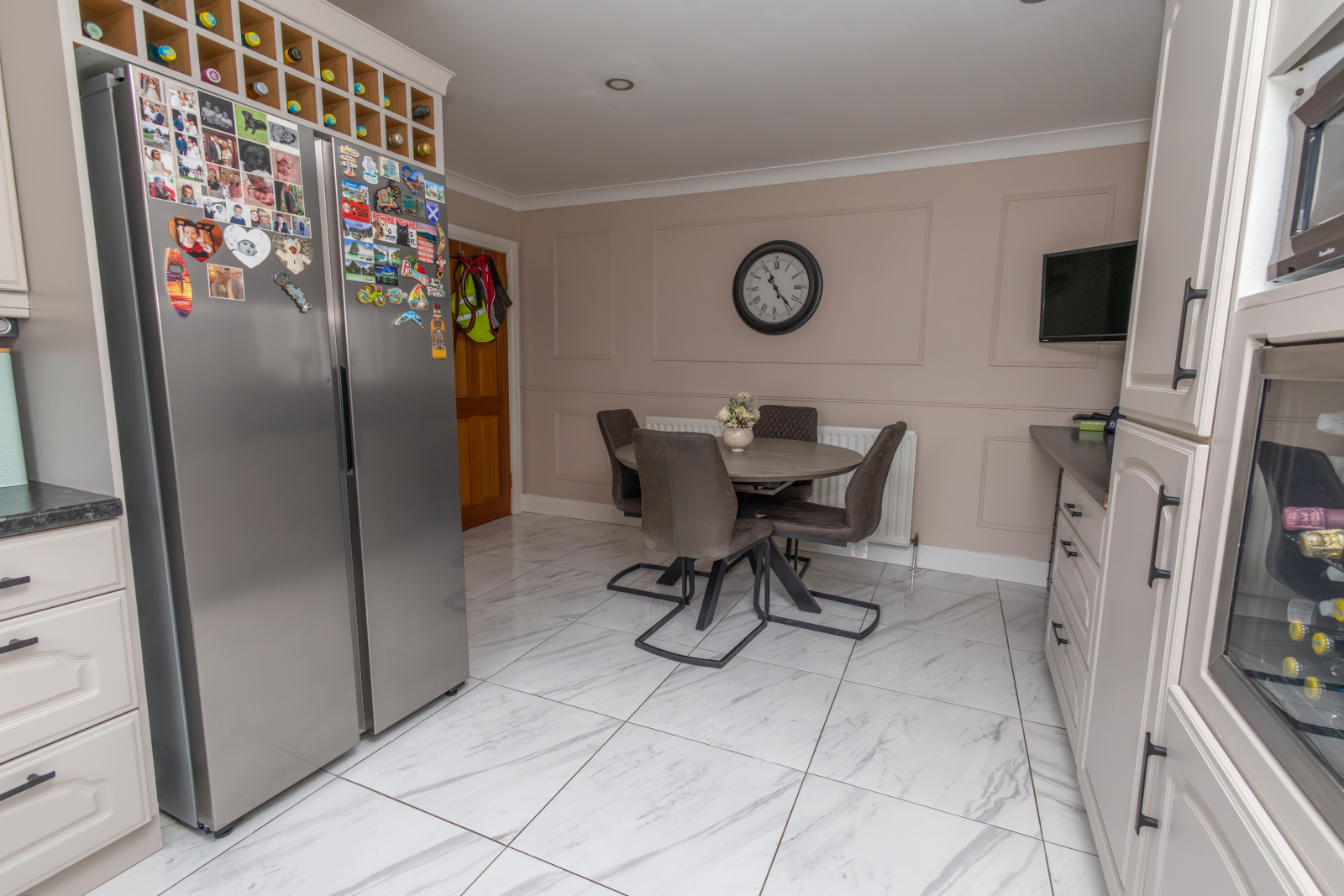 Tiled flooring with a range of upper and lower units, tiled between with a laminate worksurface. Space for a range-style cooker, dishwasher and American-style fridge freezer, with an integrated wine cooler and space for a microwave. TV point and rear aspect overlooking the rear garden.