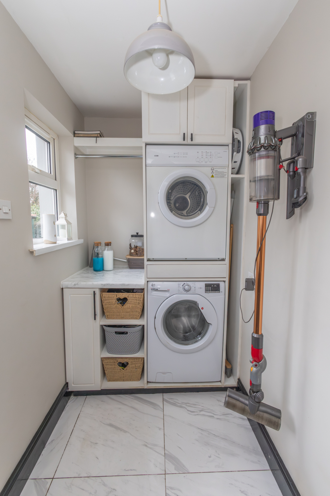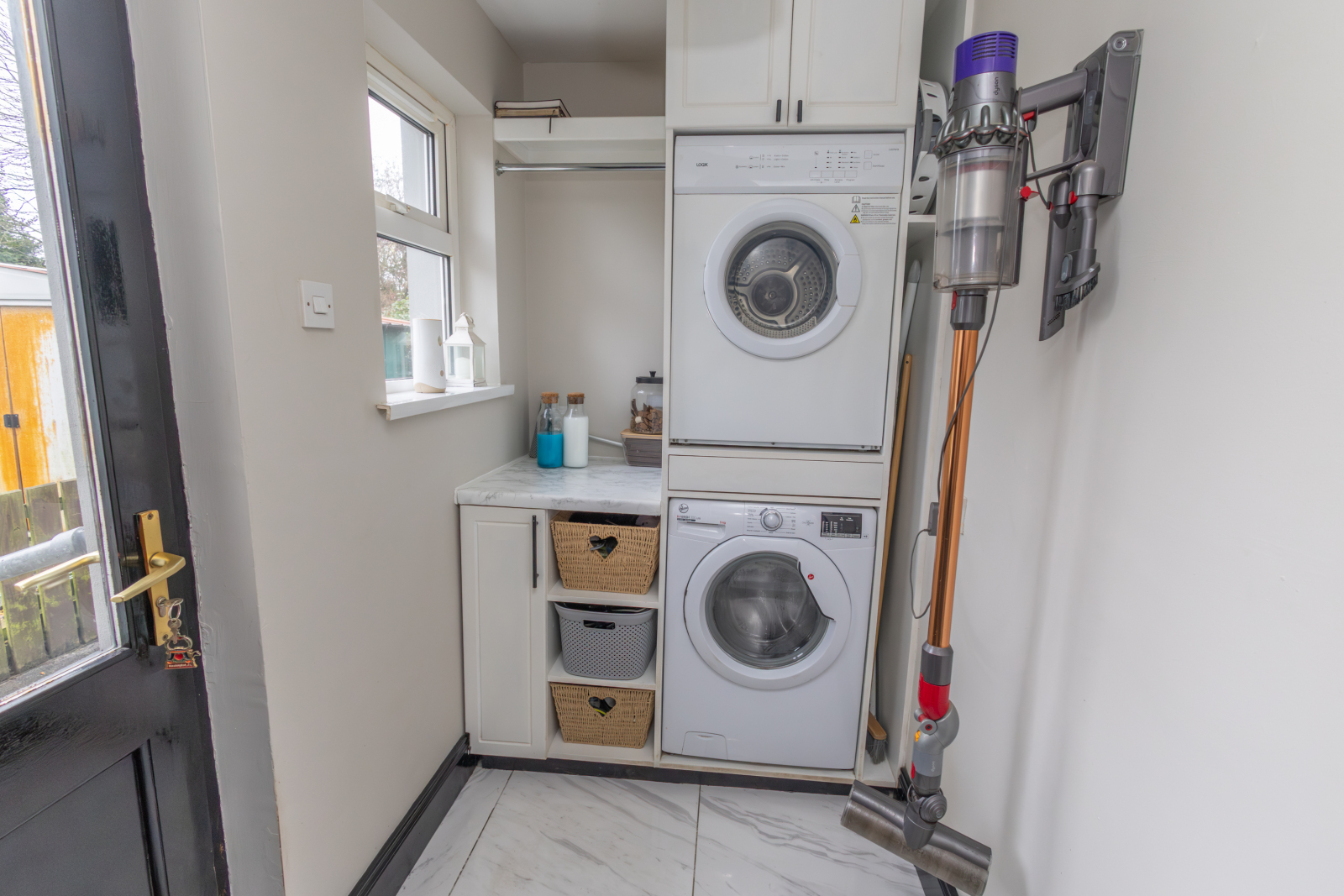 Tiled flooring. Space for a washing machine and tumble dryer. Built in storage units. Rear door leading to garden.