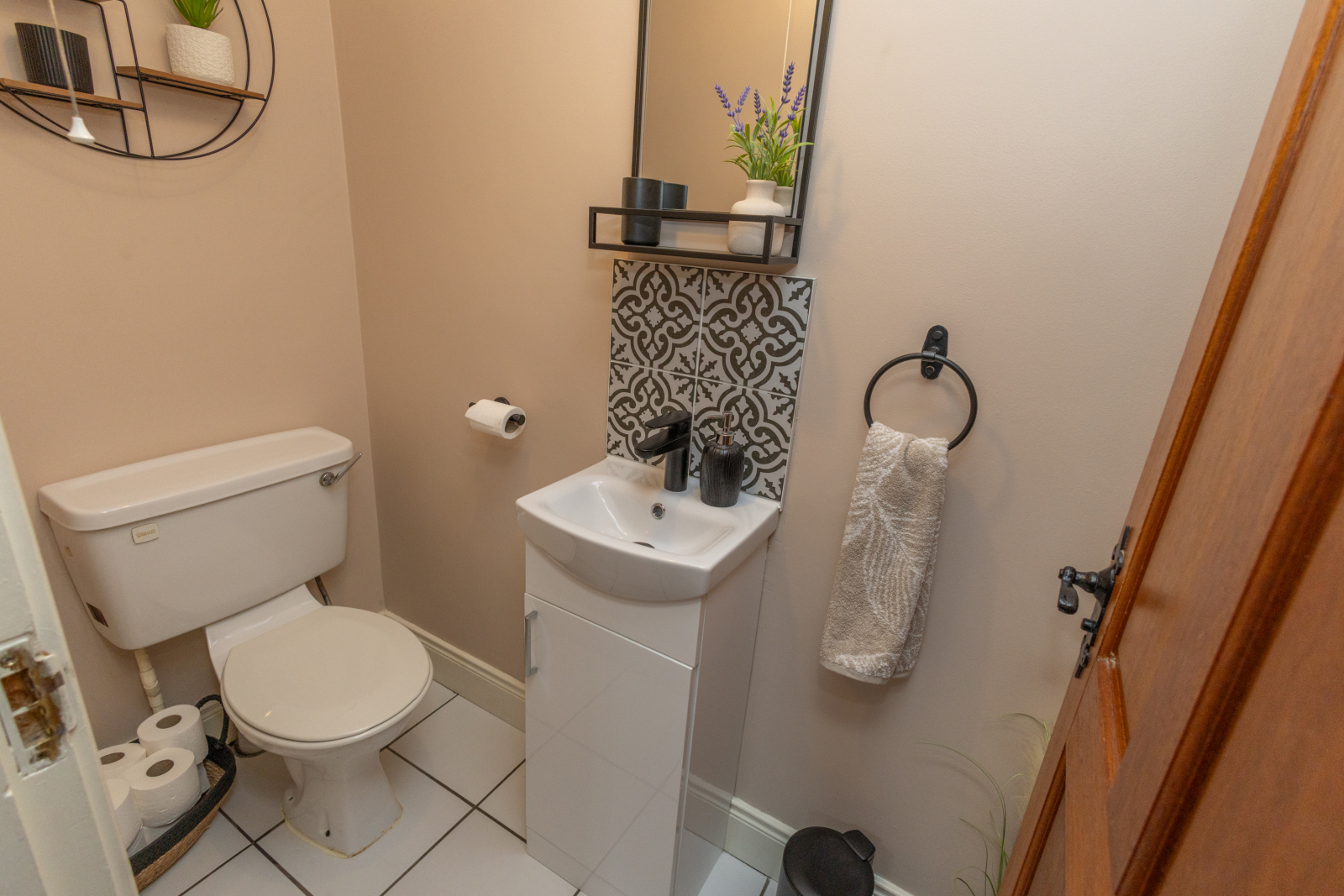 Tiled flooring with a white suite comprising WC and wash hand basin. Tiled splashback with a wall-mounted mirror above.