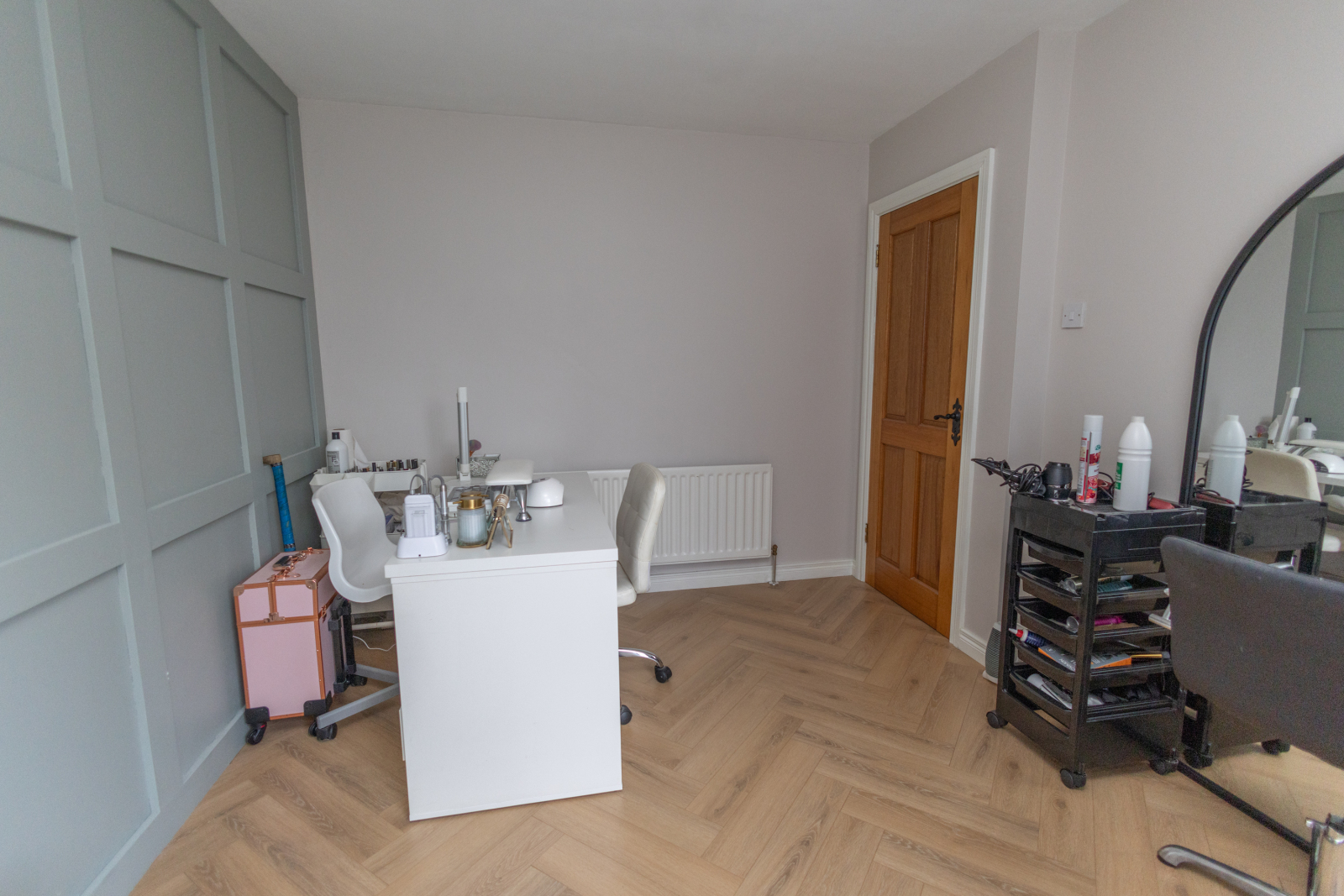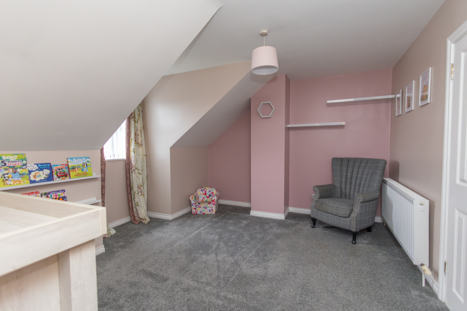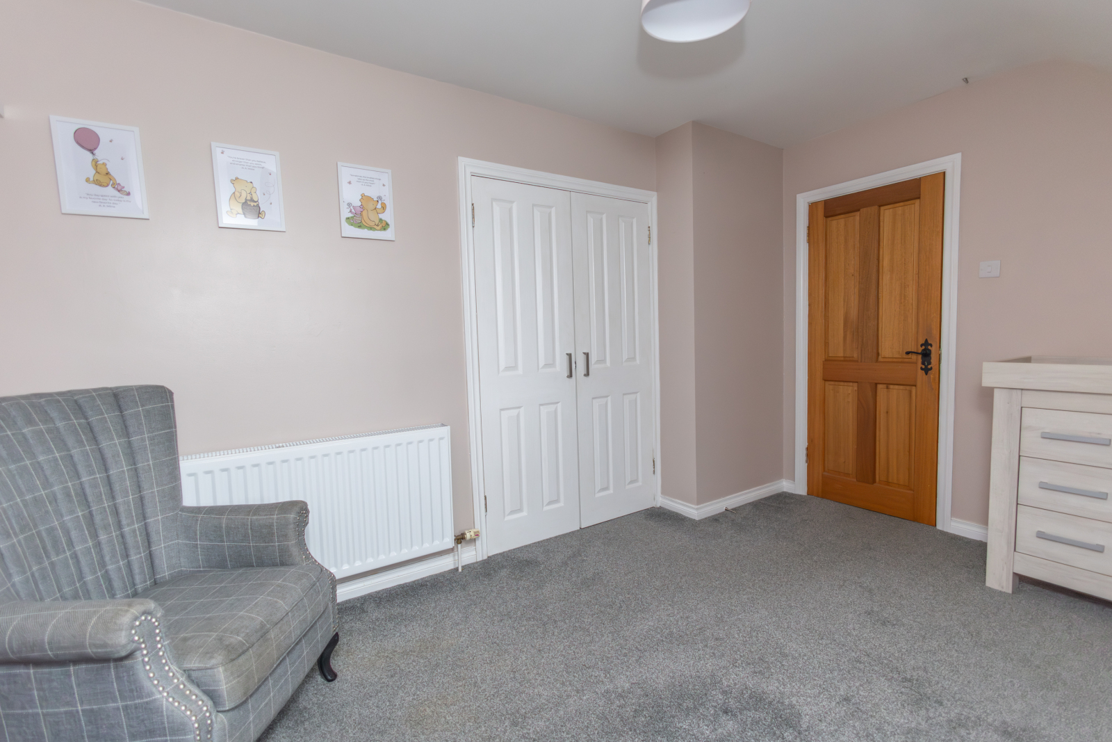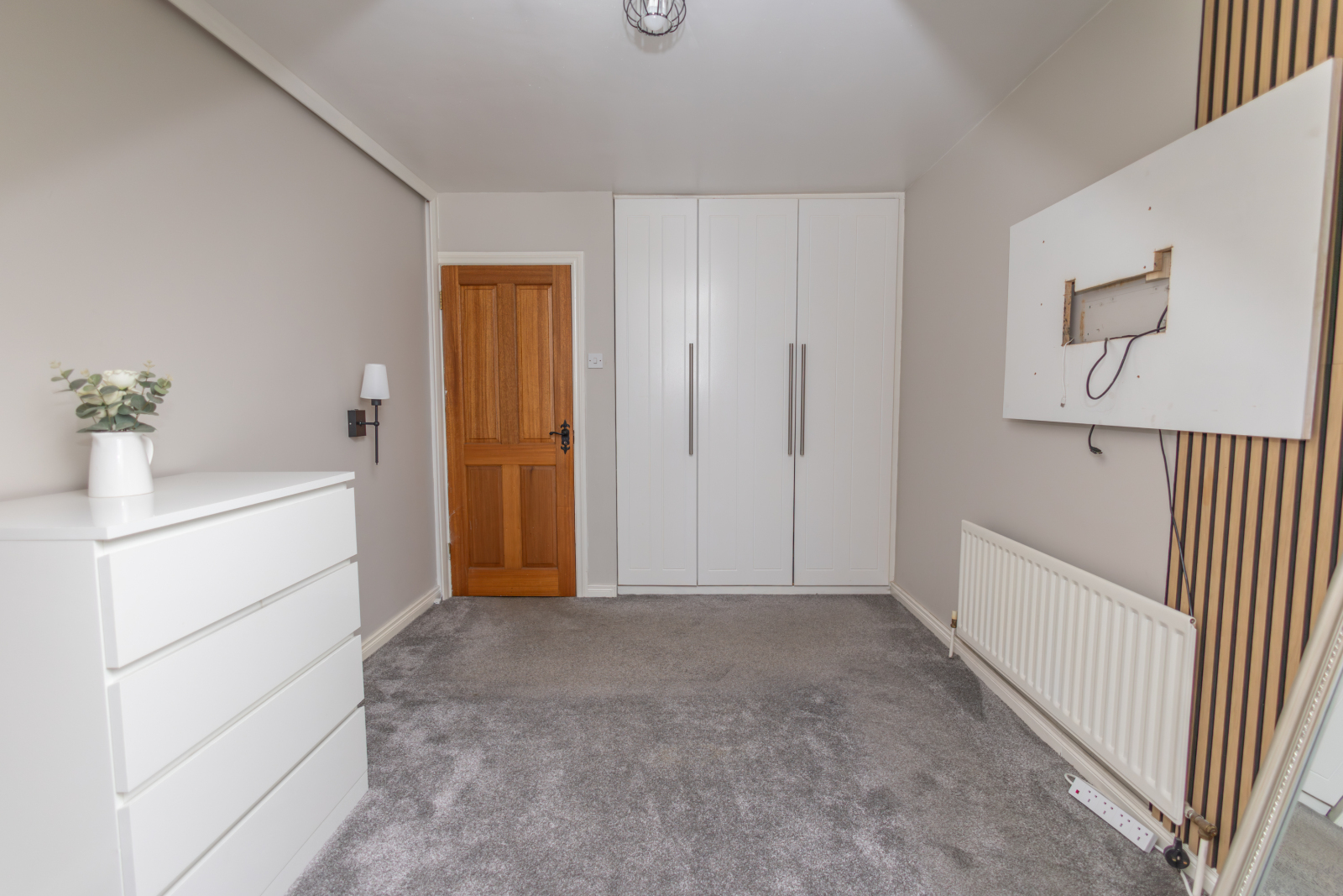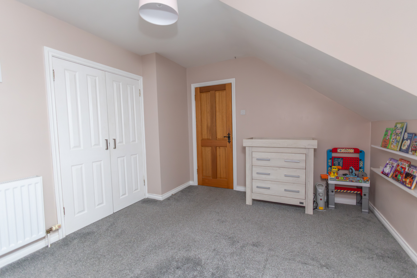 Carpet flooring with a single radiator and a small storage cloakroom.