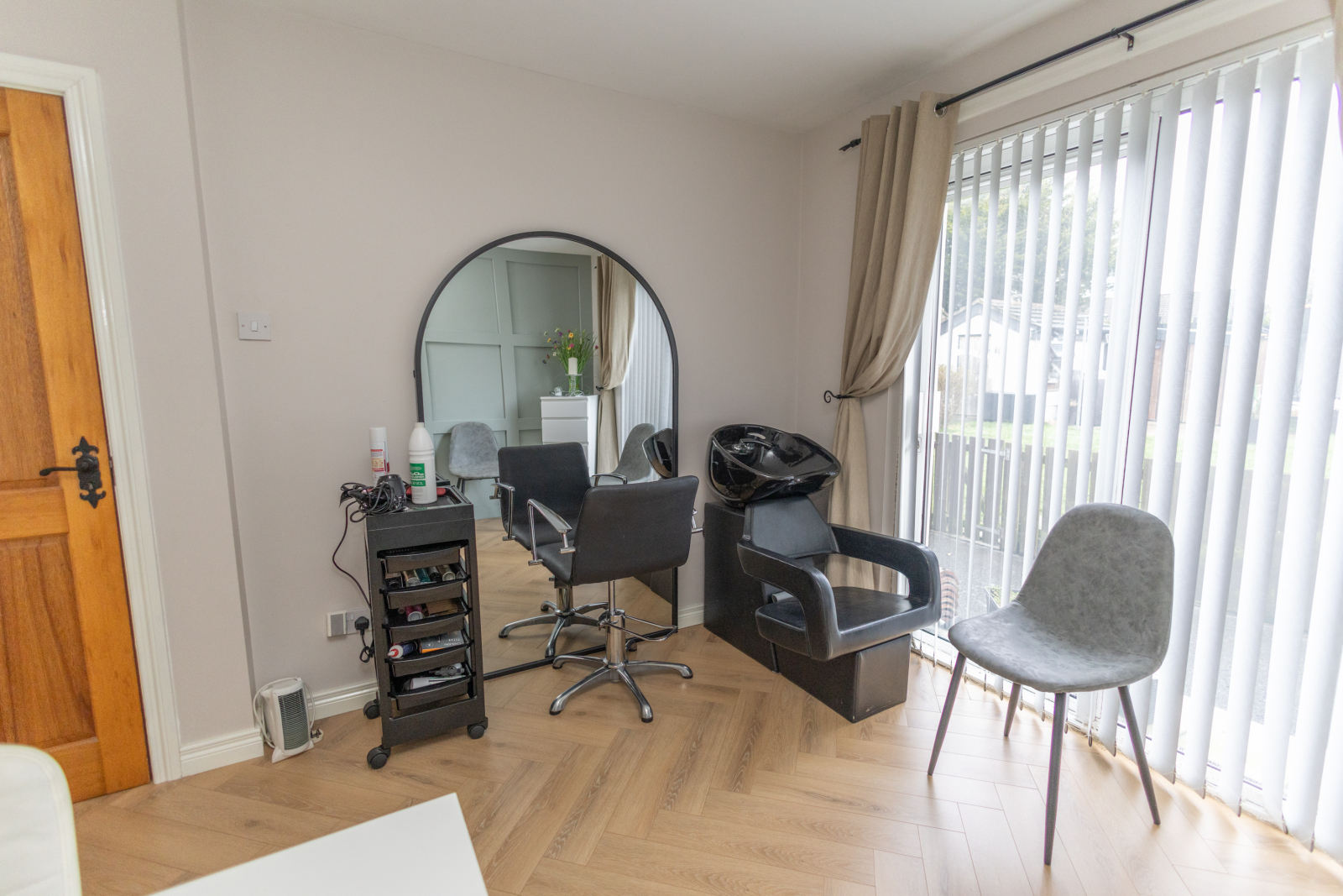 Laminate herringbone flooring with patio doors leading to the rear garden. Single radiator.