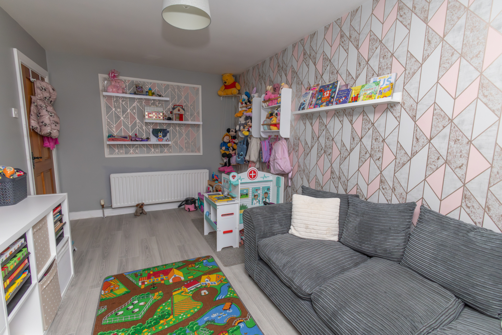 Laminate flooring with TV point and a single radiator.