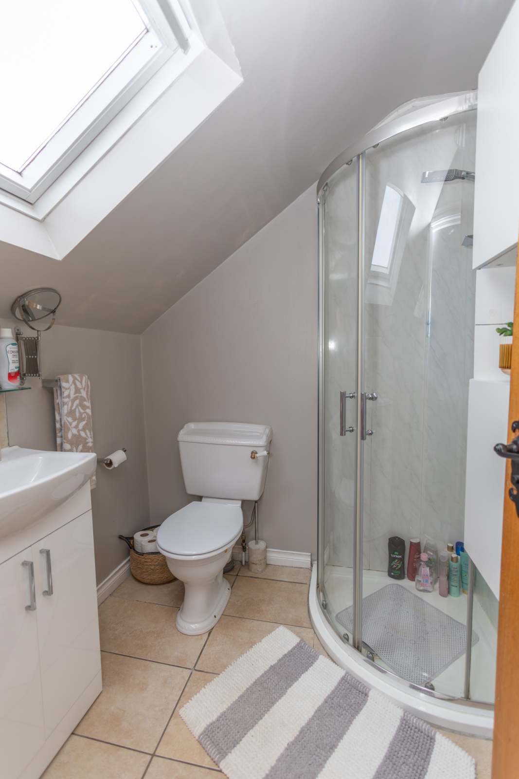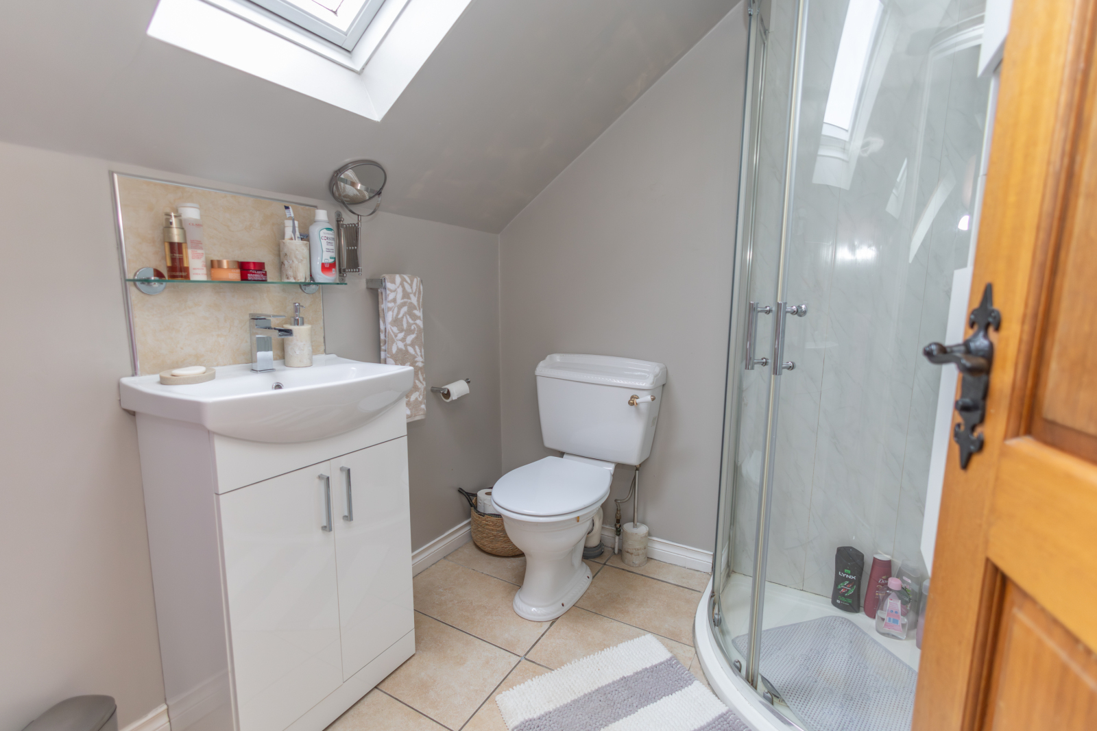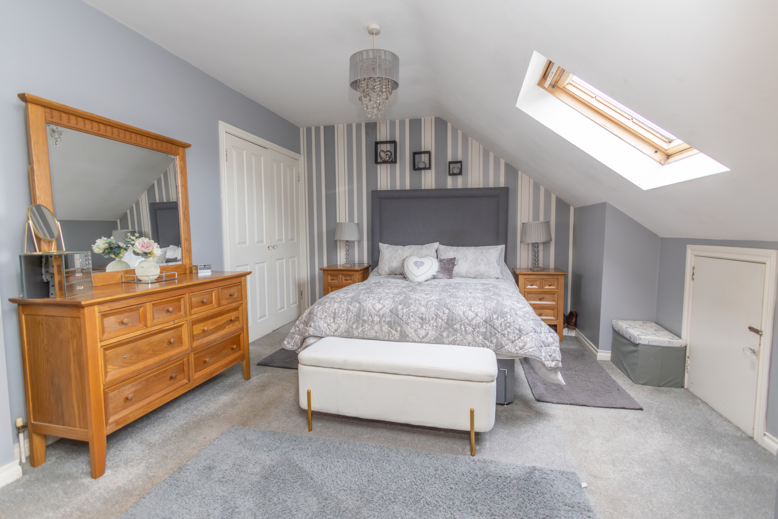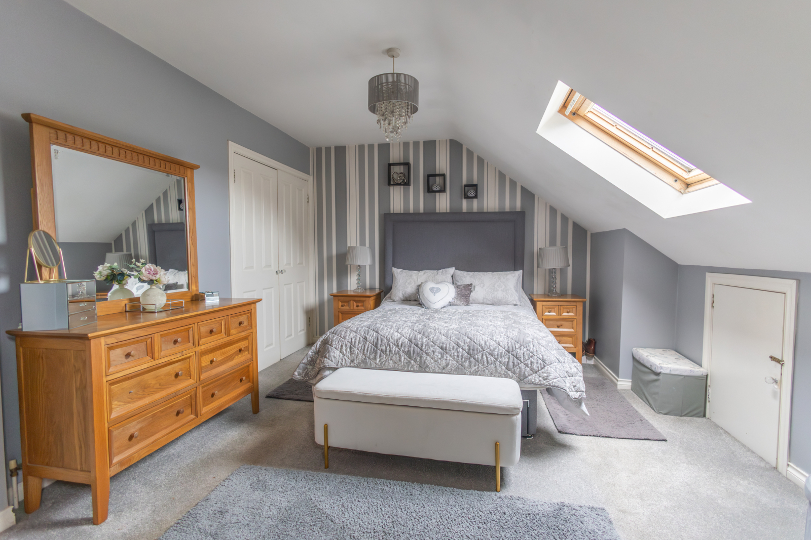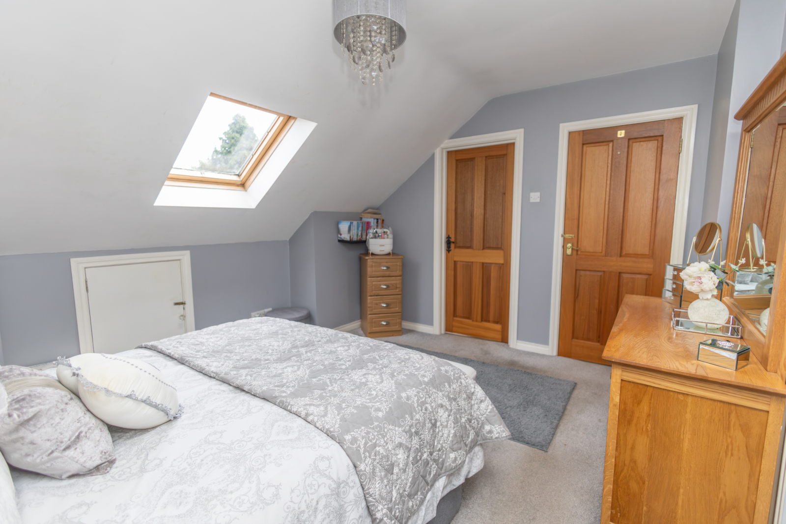 Carpet flooring with a skylight providing additional natural light. Eaves storage and built-in wardrobe space, with en-suite facilities.