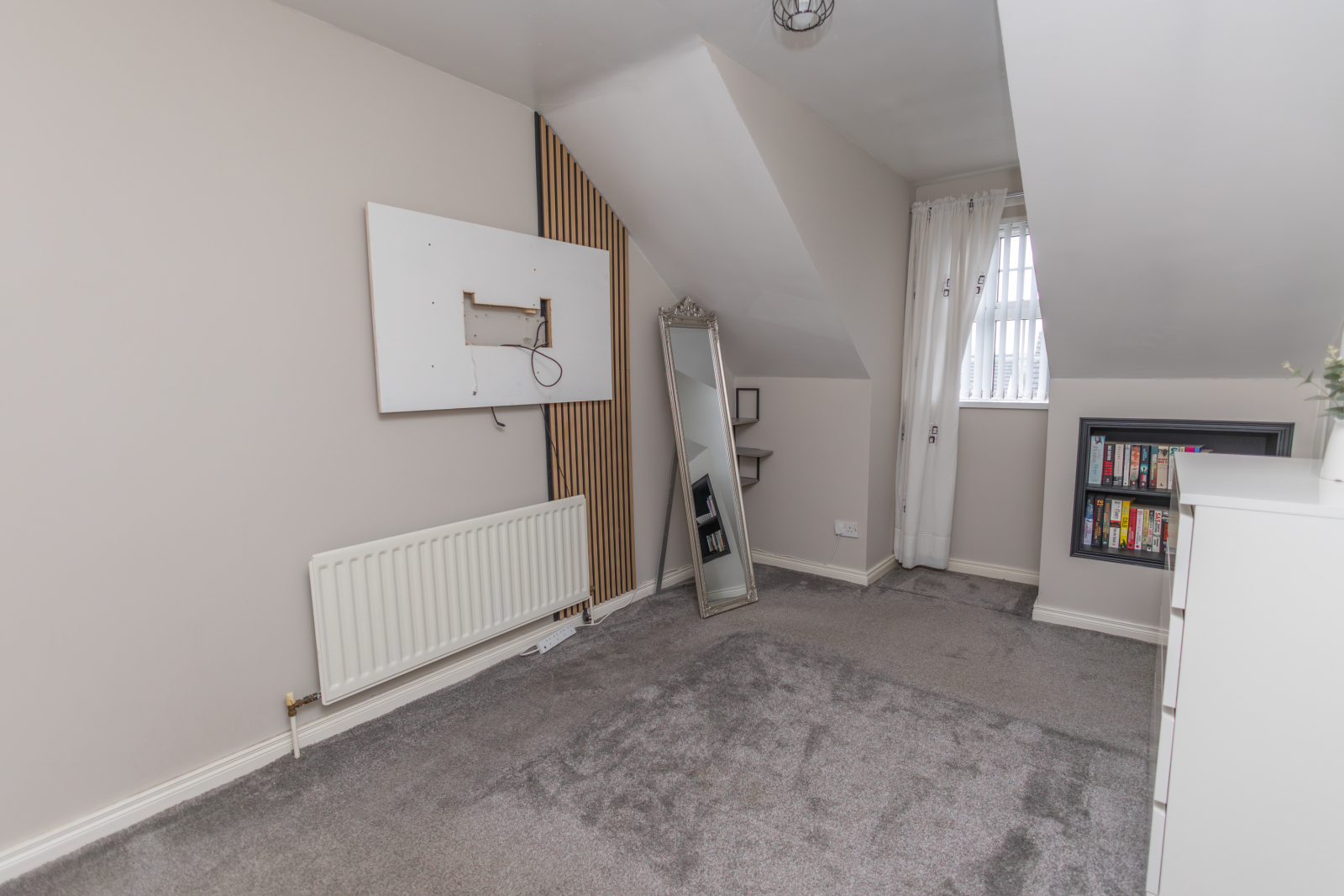 Carpet flooring with a TV point, built in shelves and wardrobe space and a single radiator.