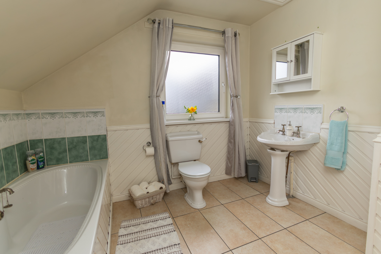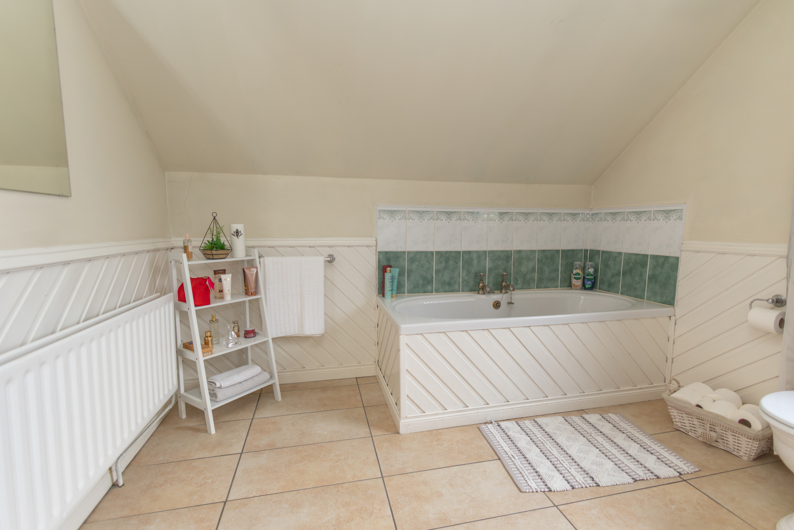 Tiled flooring with a white suite comprising WC and wash hand basin with a tiled splashback and wall-mounted vanity unit above, along with a bath, tiled behind. Half-panelled walls and a double radiator.