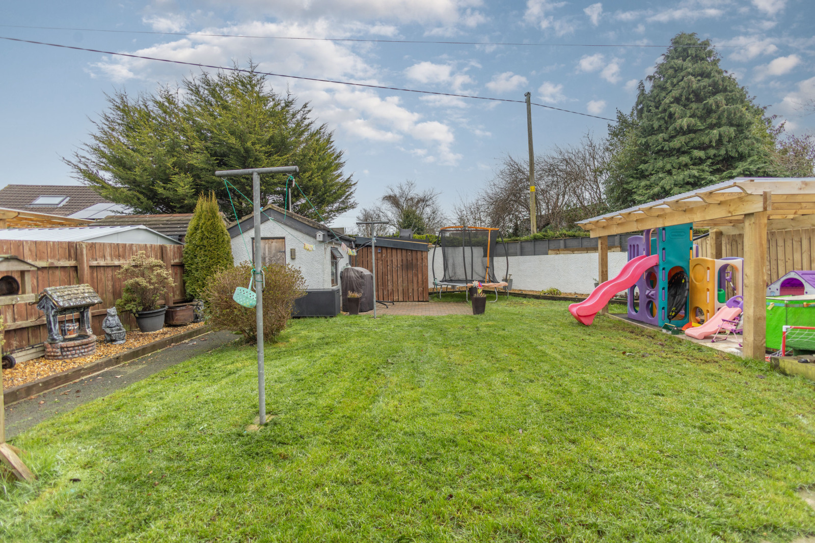 Rear: Fully enclosed rear garden laid in lawn, with a brick-paved patio area and garden sheds for storage.