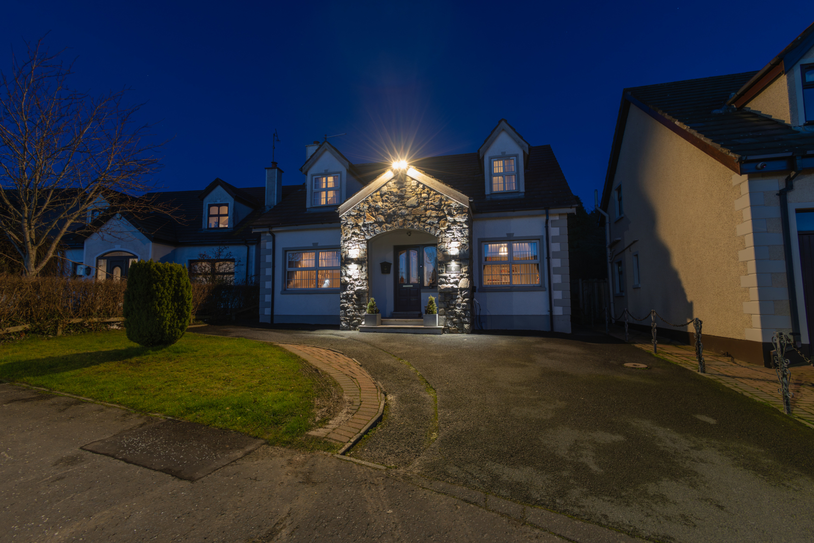 Front: Tarmac driveway with a lawned front garden and an electric charging point. Newly pointed stonework to the porch.