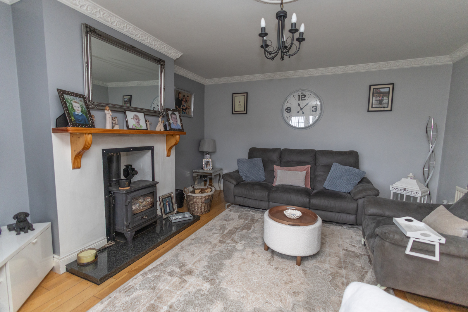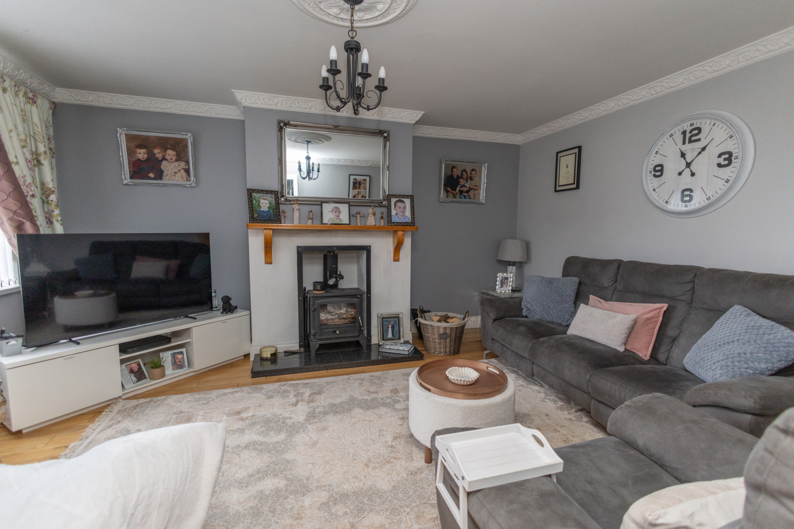 Hardwood flooring with a multi-fuel stove set on a polished granite hearth and a wooden mantelpiece. TV point, coving, and a ceiling rose.