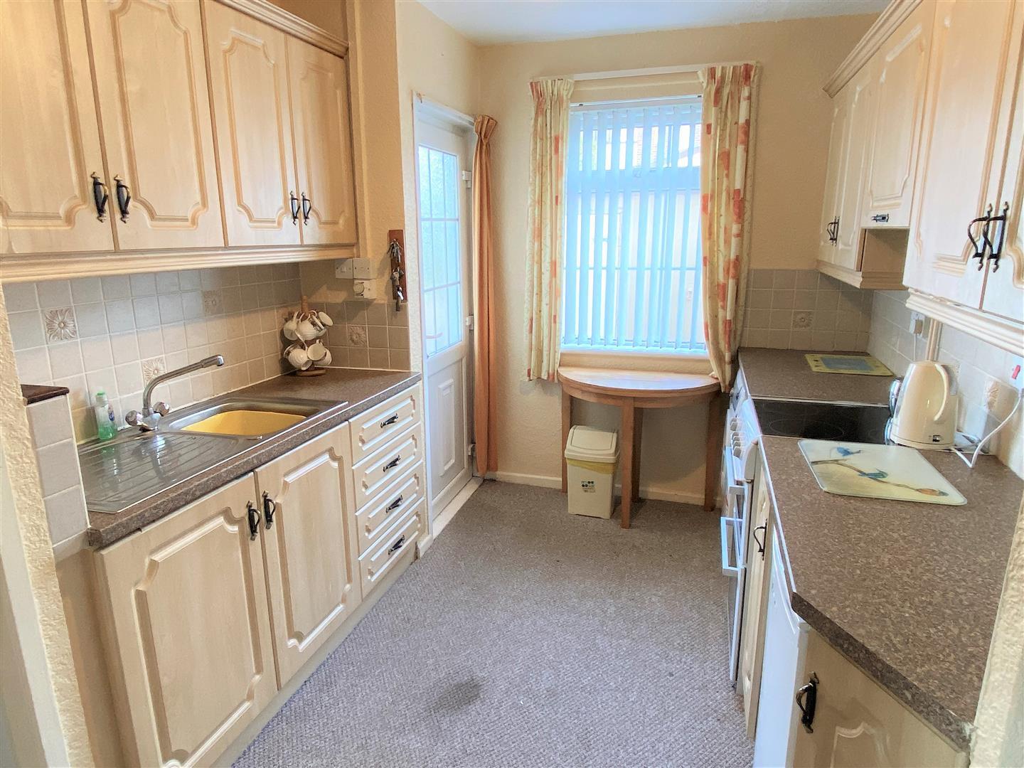 Range of high and low level units with laminate work surface and doors. Stainless steel sink and drainer. Part wall tiling, plumbed for washing machine.