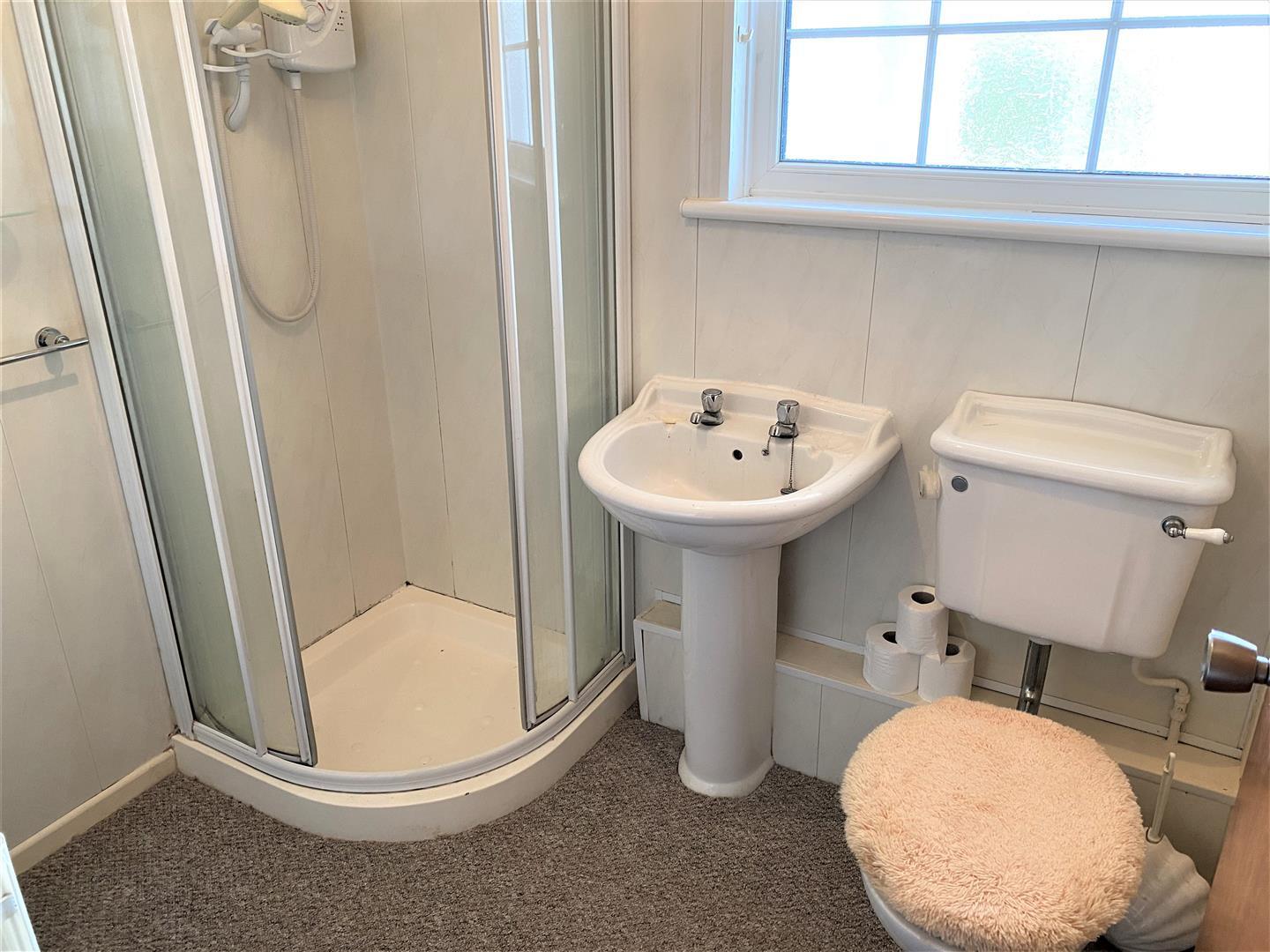 White suite comprising W.C, WHB, Quadrant shower cubicle with electric shower. Part PVC wall panelling.