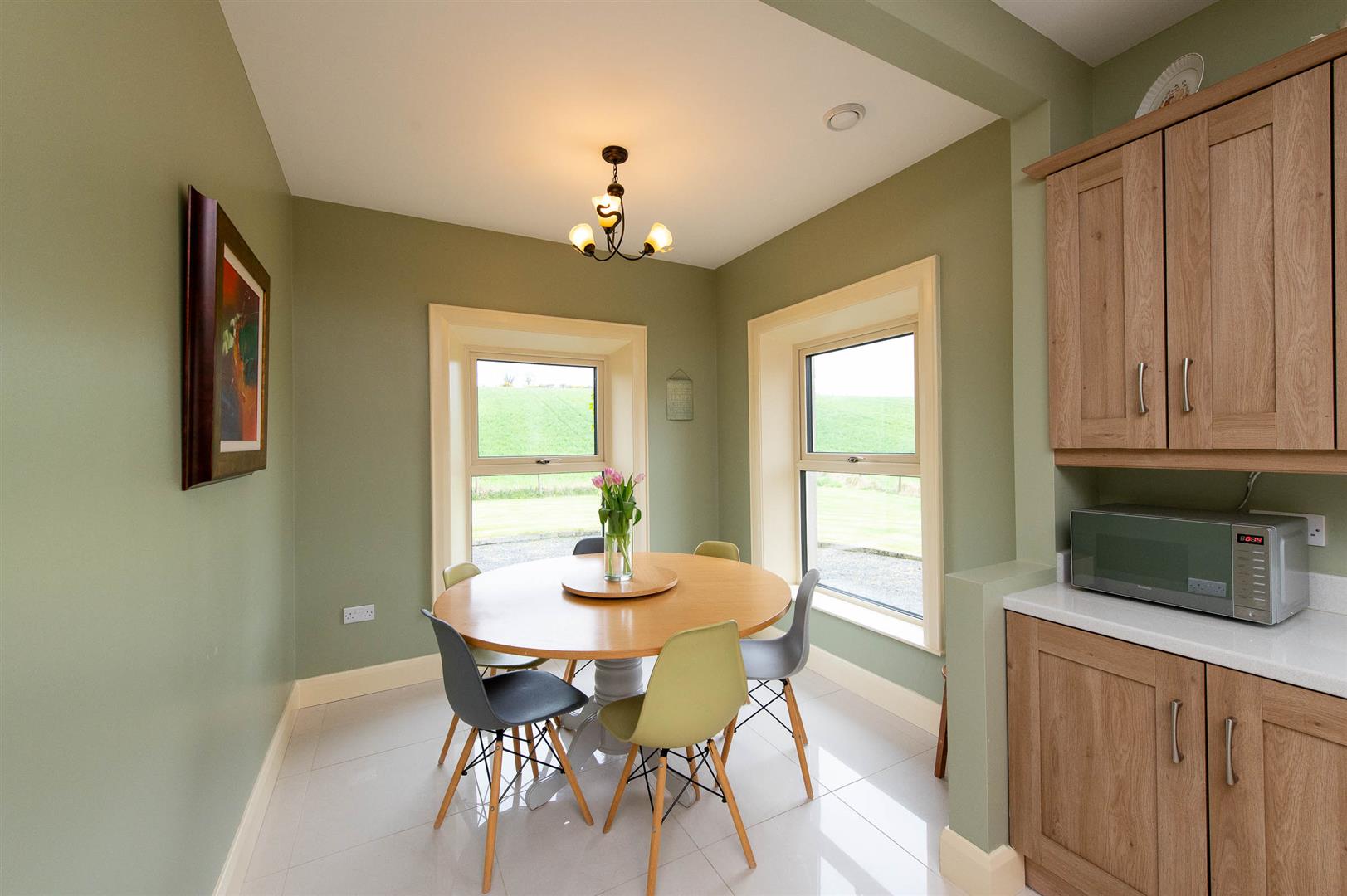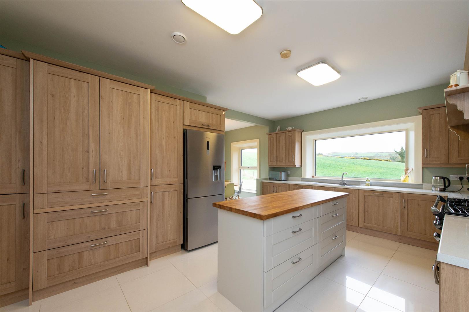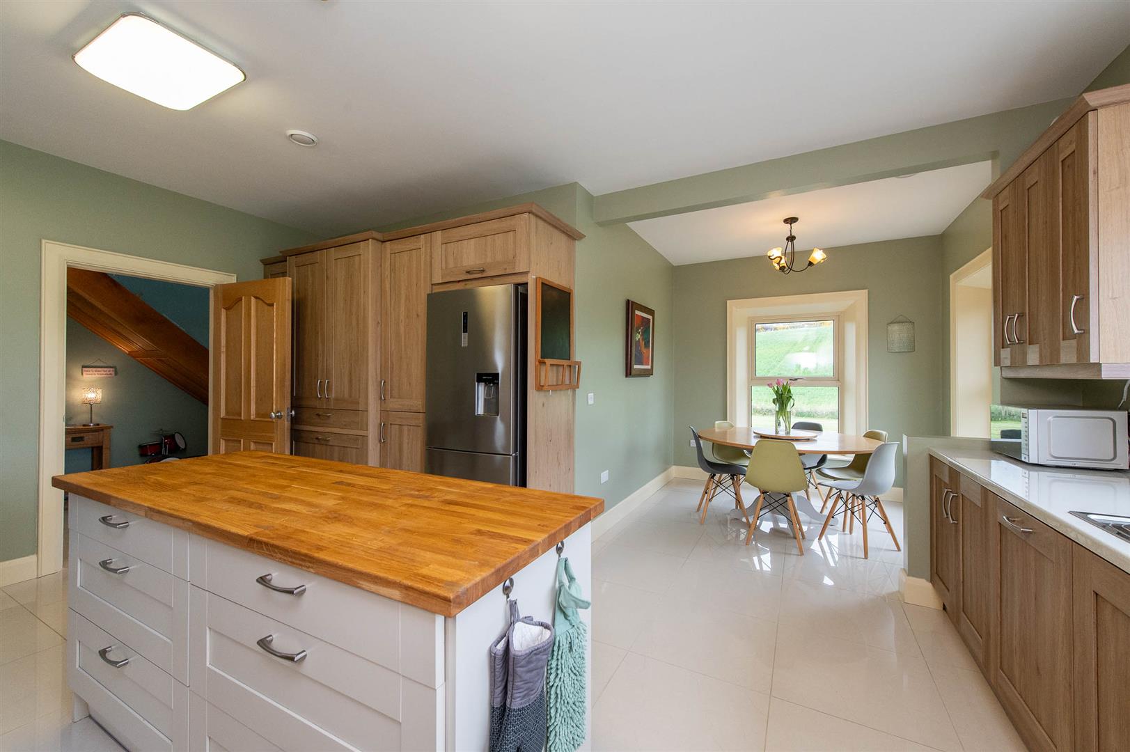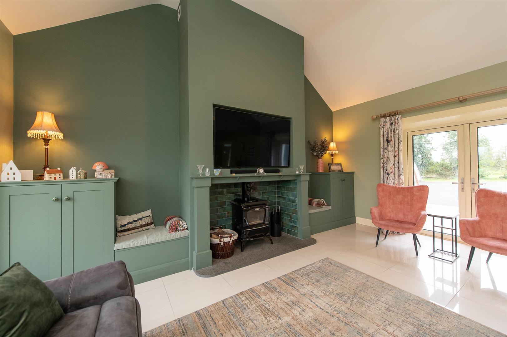 Stunning entrance hallway with tiled flooring and striking Oak staircase. Ground floor W.C accessed from main hallway along with Lounge, comprising hard wood flooring, ample natural light and a perfectly placed multi fuel stove which is connected to heat and water. Study/Office space also accessed from main entrance hallway with laminate flooring. The Kitchen style is contemporary with space for stove and free standing fridge freezer, including integrated dishwasher. Nicely situated centre island for additional work space. Open plan to dining area with fully tiled floor throughout. Living room again with tiled flooring, high ceilings, patio doors and another perfectly placed multi fuel stove. Rear hallway with tiled flooring, line closet, access to back and a separate utility room with a range of low level modern units and tiled floor with space for washing machine & dryer.