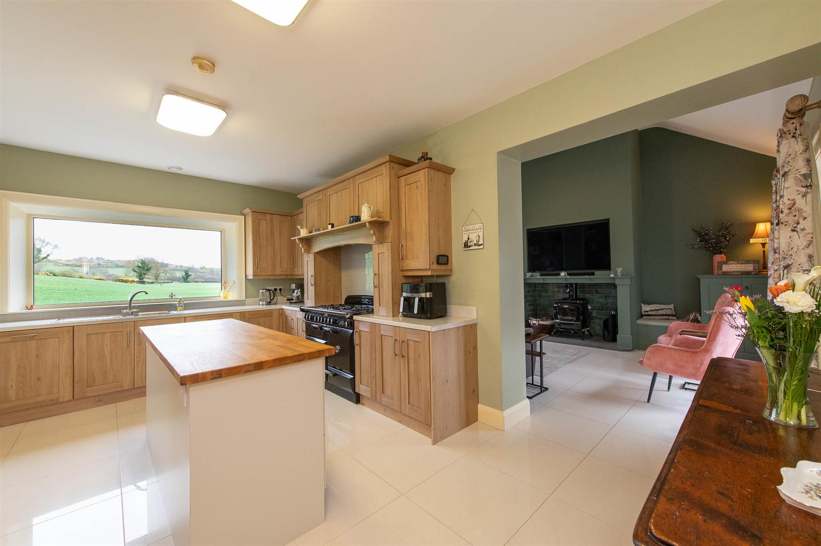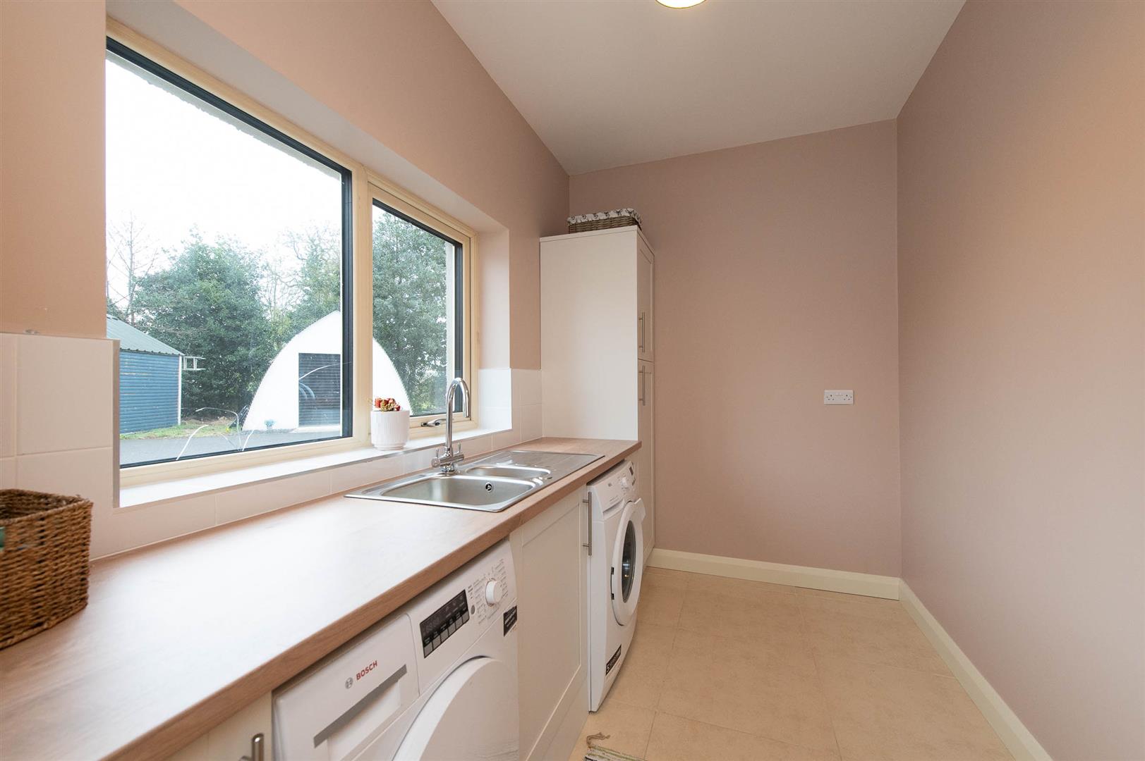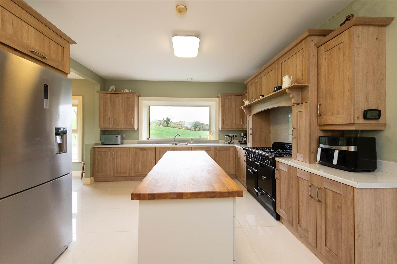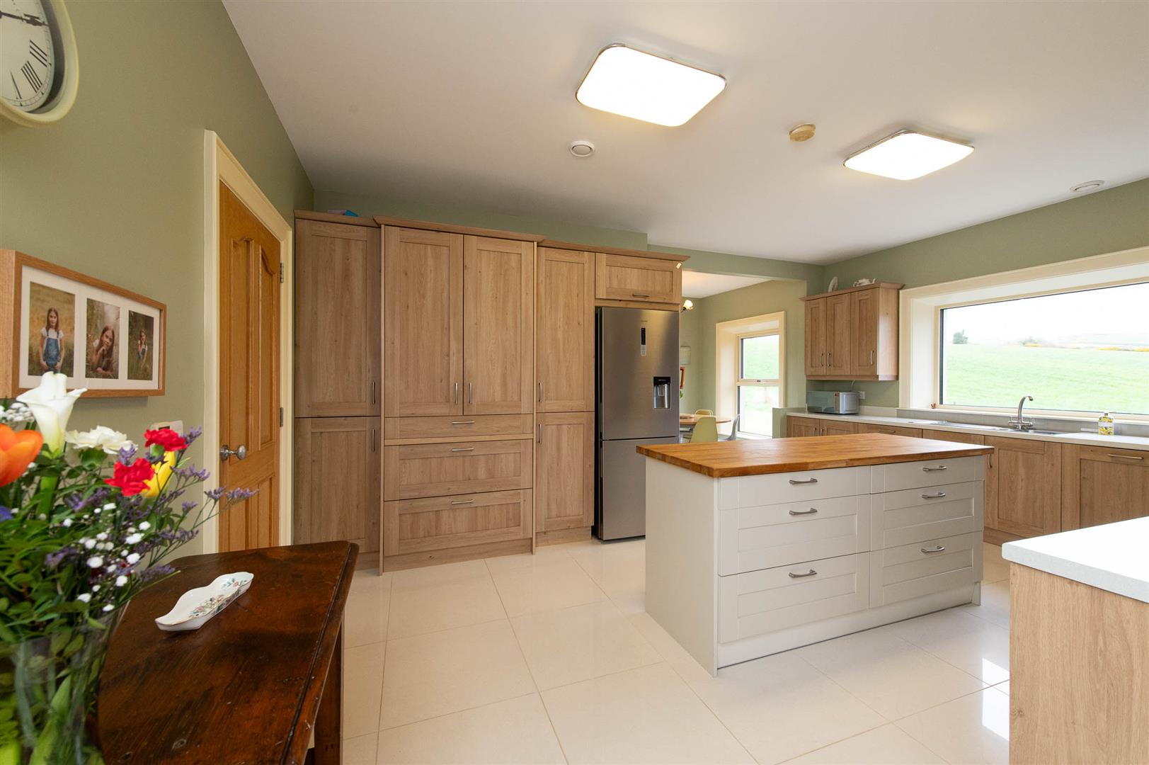 Stunning entrance hallway with tiled flooring and striking Oak staircase. Ground floor W.C accessed from main hallway along with Lounge, comprising hard wood flooring, ample natural light and a perfectly placed multi fuel stove which is connected to heat and water. Study/Office space also accessed from main entrance hallway with laminate flooring. The Kitchen style is contemporary with space for stove and free standing fridge freezer, including integrated dishwasher. Nicely situated centre island for additional work space. Open plan to dining area with fully tiled floor throughout. Living room again with tiled flooring, high ceilings, patio doors and another perfectly placed multi fuel stove. Rear hallway with tiled flooring, line closet, access to back and a separate utility room with a range of low level modern units and tiled floor with space for washing machine & dryer.