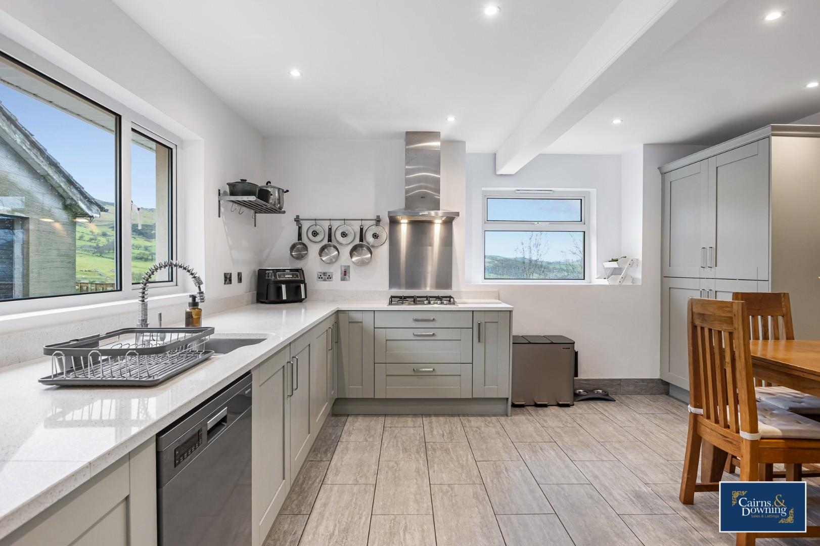 The bungalow boasts four excellently proportioned bedrooms, one of which is currently utilised as a family room, providing ample space for relaxation and family gatherings. The large, bright, and airy kitchen dining area is ideal for entertaining guests or enjoying family meals, while the spacious family living room features a charming fireplace and a log-burning stove, creating a warm and inviting atmosphere during the colder months.