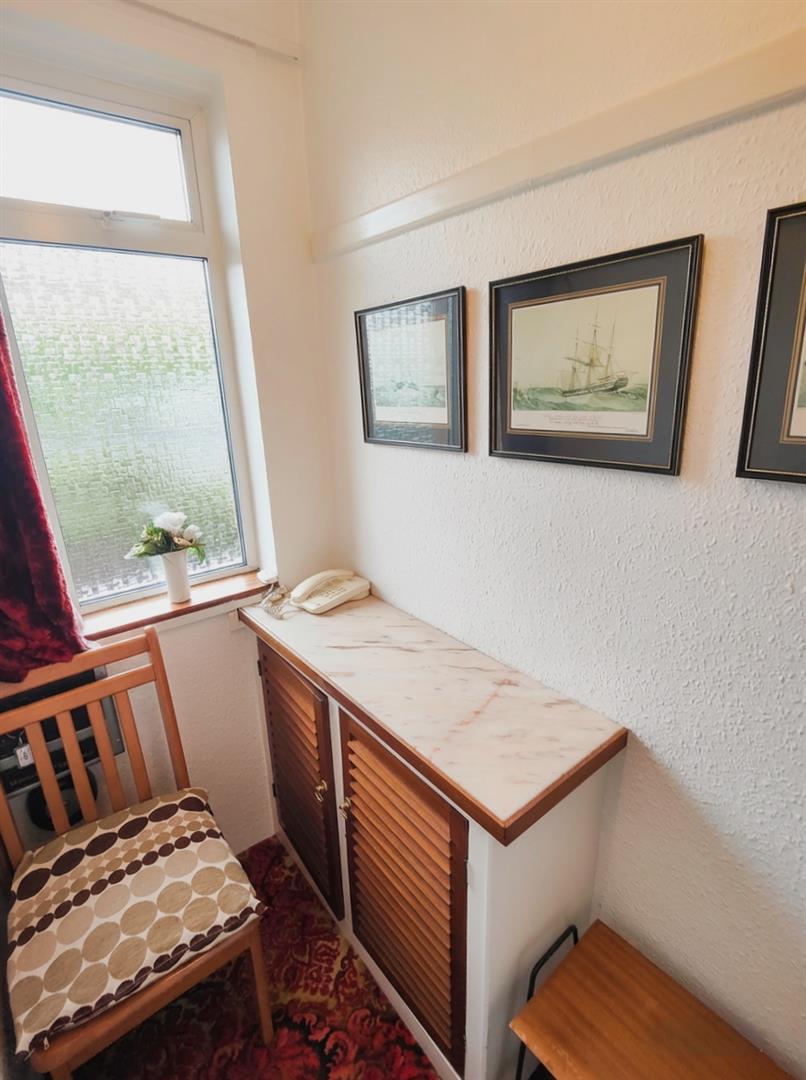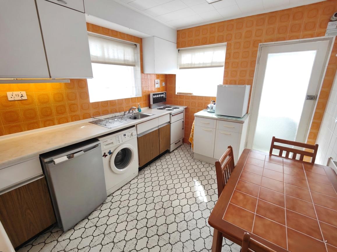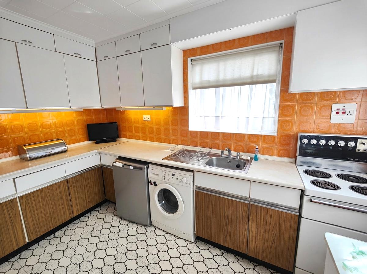 Single drainer stainless steel sink unit, range of high and low level units, formica worktops, cooker space, under fridge space, plumbed for washing machine, fully tiled walls, ceramic tiled floor, panelled radiator.