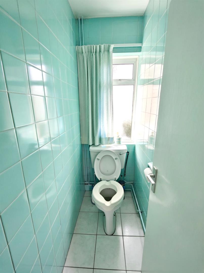 Matching low flush wc, fully tiled walls, ceramic tiled floor.