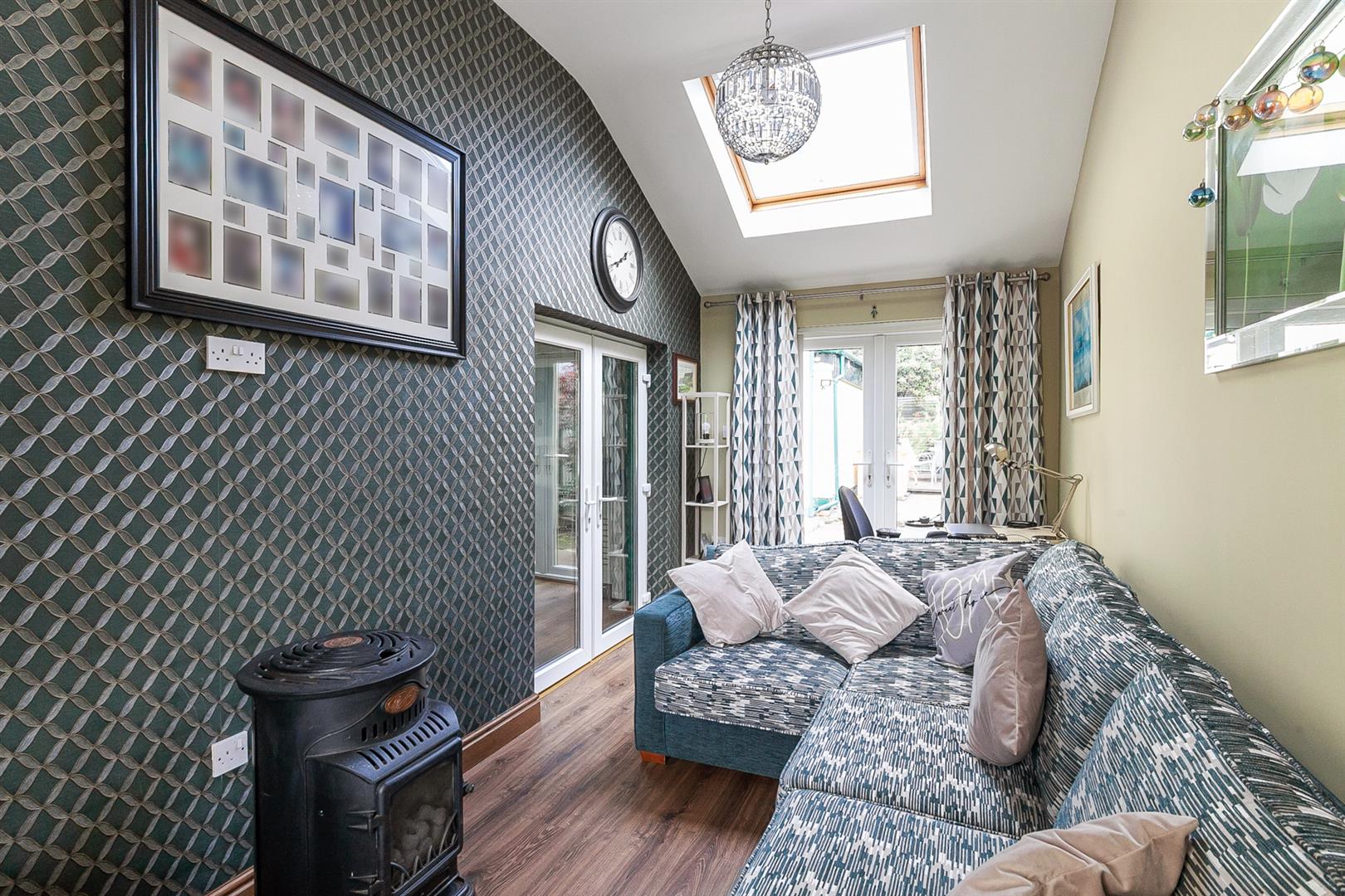 Wood laminate floor, pvc patio doors, velux rooflight, double panelled radiator.