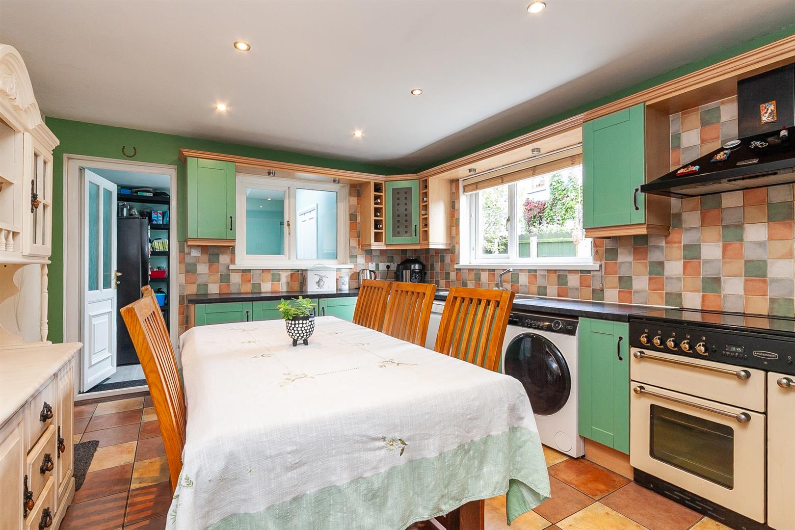 Bowl and a half stainless steel sink unit, extensive range of high and low level units, formica worktops, built-in range style cooker with 5 ring gas hob, stainless steel canopy extractor fan, plumbed for dishwasher, plumbed for washing machine, partially tiled walls, ceramic tiled floor. recessed lighting, understairs storage, double panelled radiator, pvc door to: