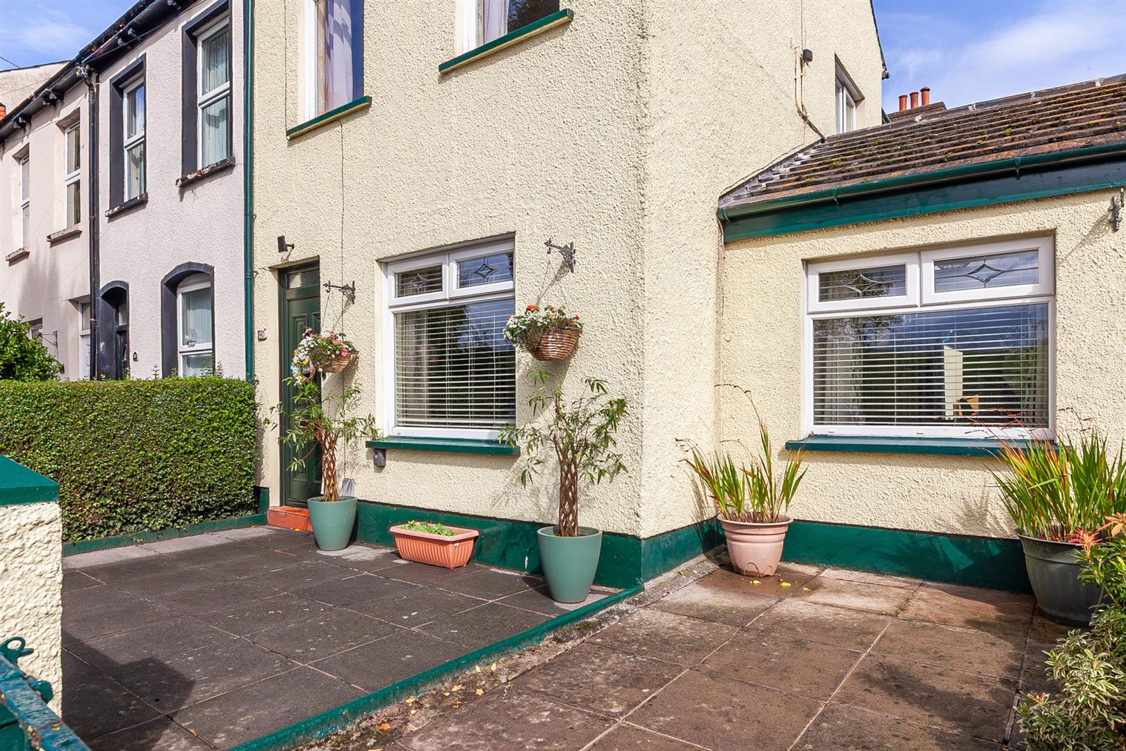 Hard landscaped gardens front and rear in feature patio areas, shrubs and flowerbeds, outside tap and light.