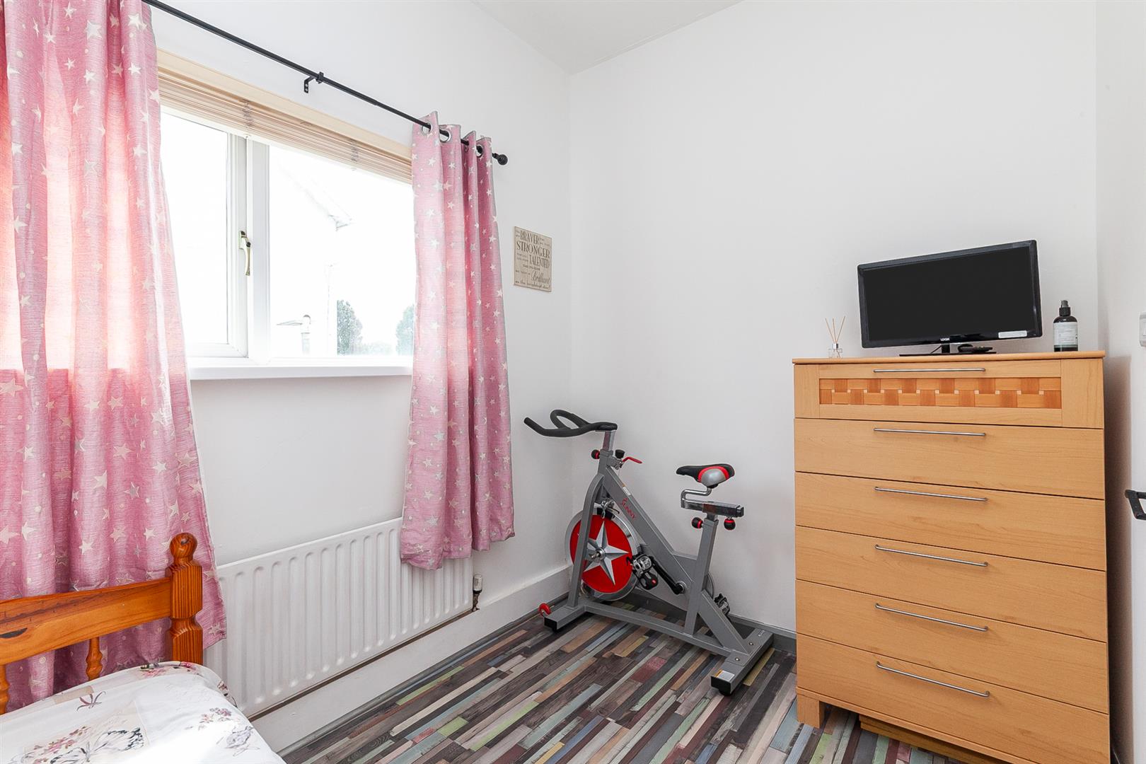 Wood laminate floor, two double panelled radiator.