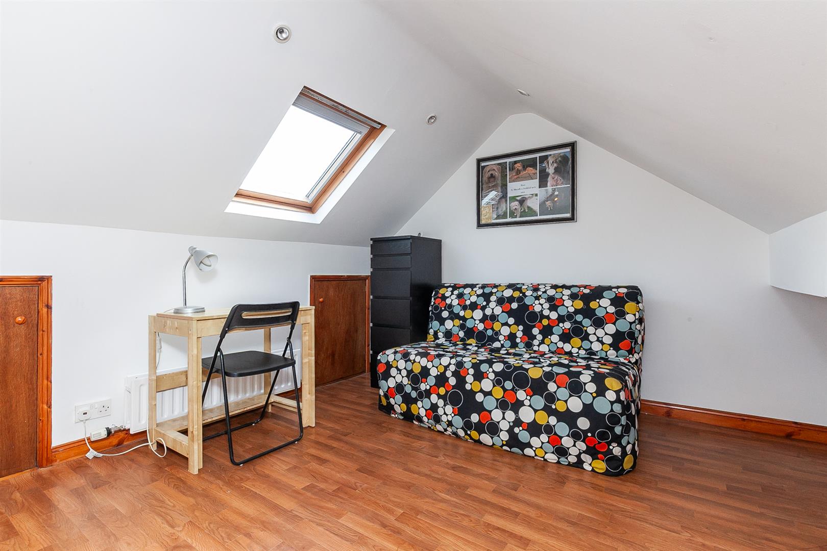 Via fixed staircase, Lvf flooring, under eaves storage, velux roof light, recessed lighting, double panelled radiator.