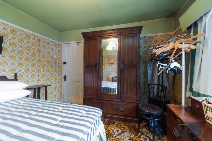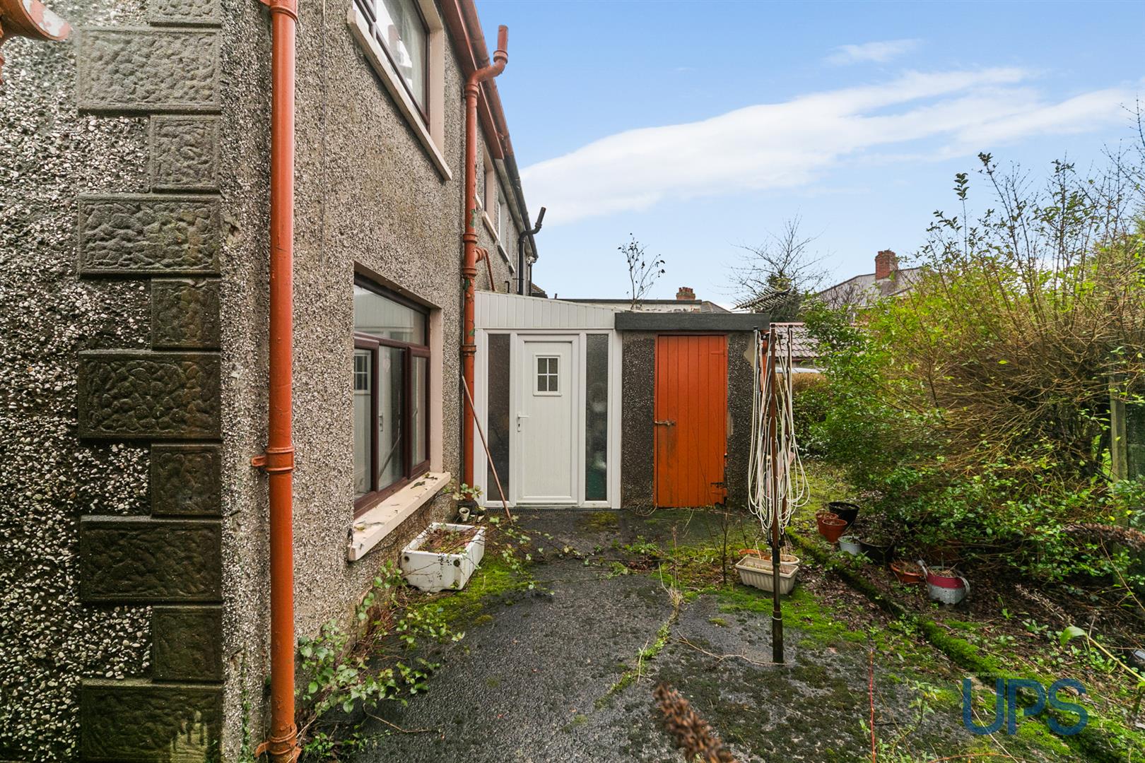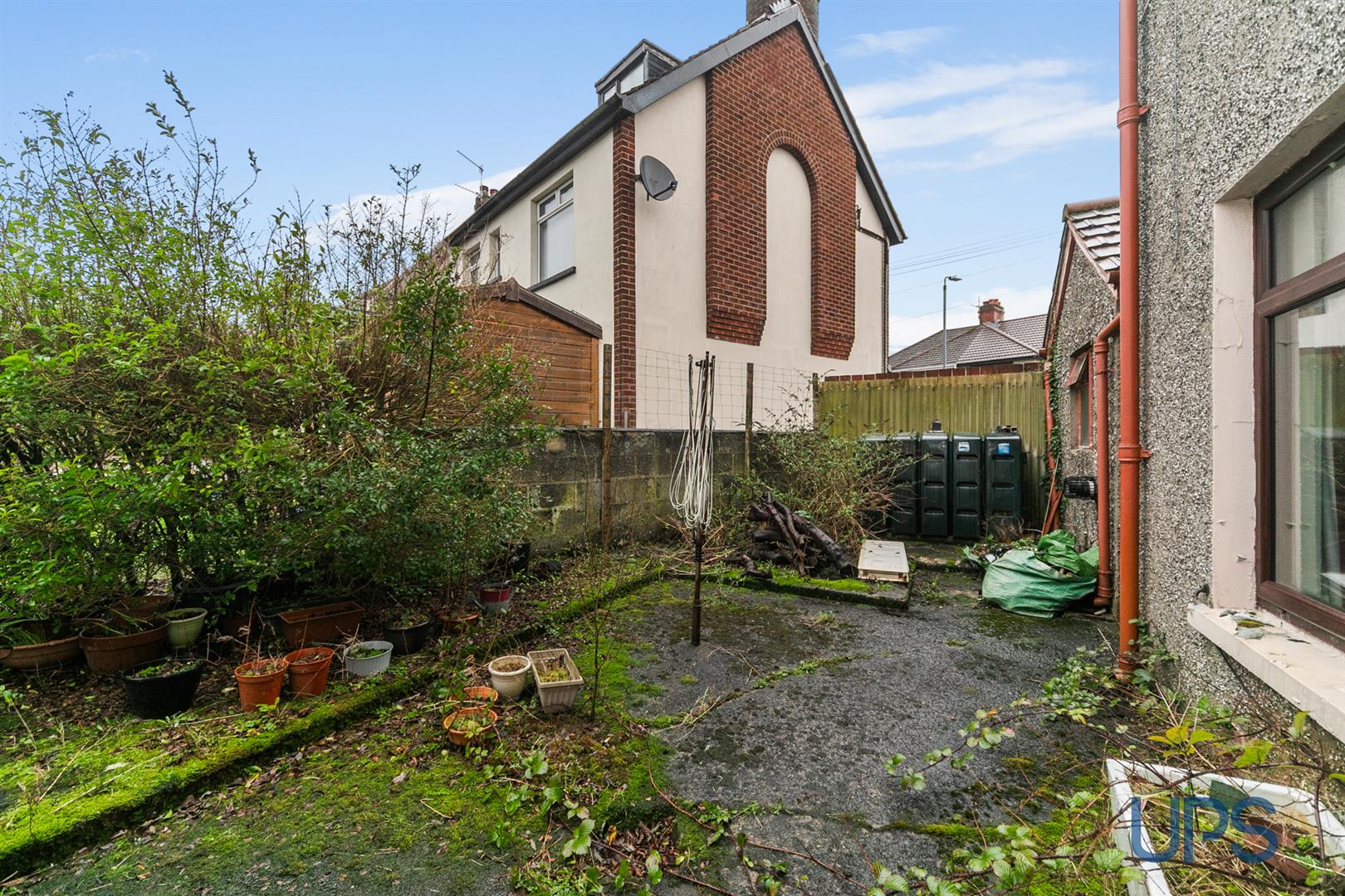 Mature gardens front and side in mature lawn, shrubs and flowerbeds, hard landscaped rear with covered storage area to include outside tap, plumbed for washing machine, upvc glazed rear door.