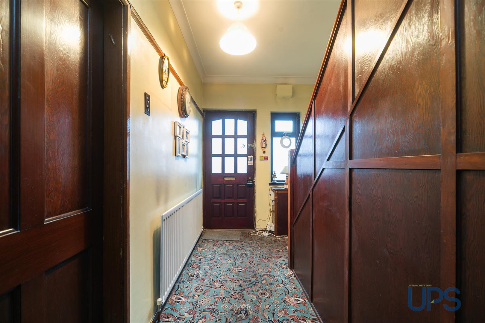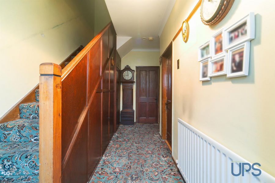 Hardwood entrance door, under stairs storage, picture rail, panelled radiator.