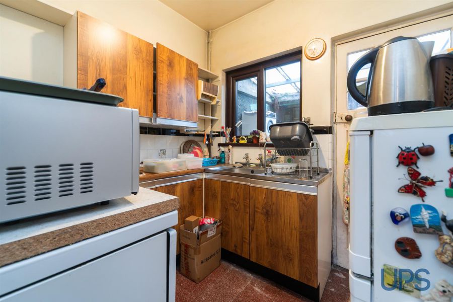 Single drainer stainless steel sink unit, range of high and low level units, cooker space, fridge/freezer space, plumbed for washing machine, partly tiled walls, ceramic tiled floor, under stairs storage, hardwood door to rear.