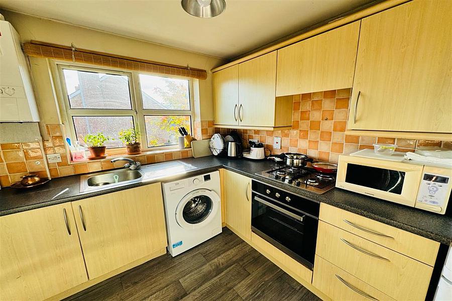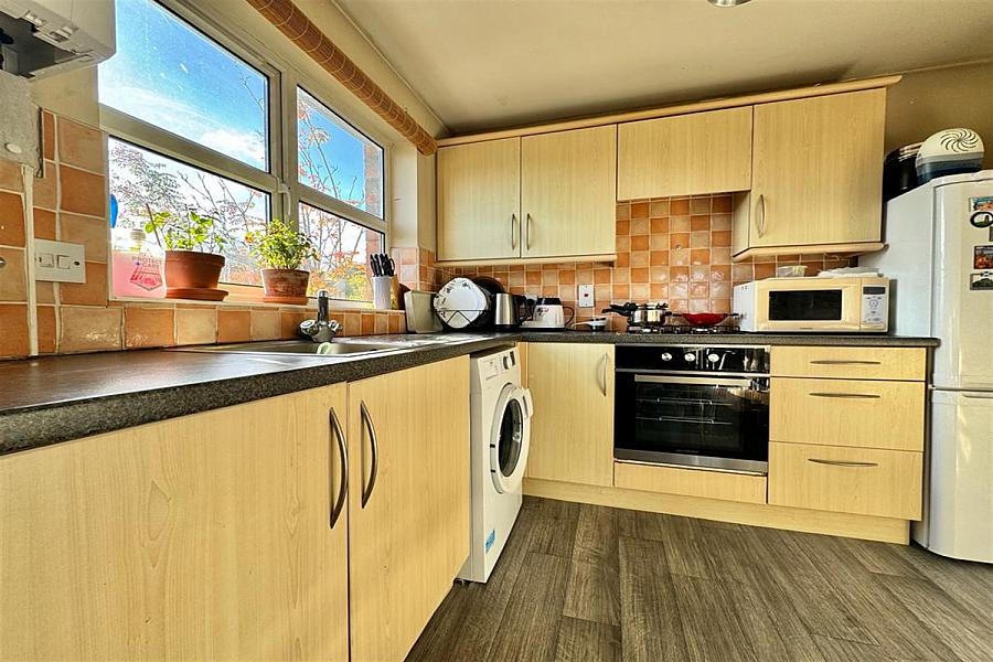 Integrated stainless steel oven, four ring gas hob, plumbed for washing machine, space for fridge/freezer, partly tiled walls, wood effect laminate flooring.