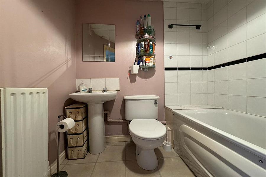 White suite comprising pedestal wash hand basin, low flush W/C, panelled bath with shower over, shower screen, partly tiled walls, tiled floor.