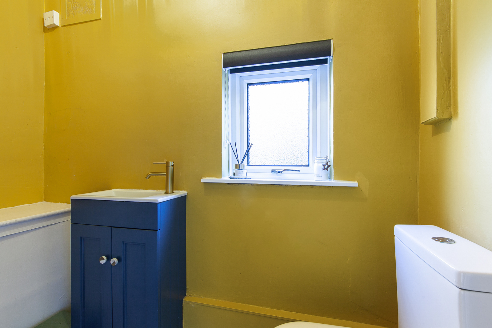 Comprises of low flush WC, ceramic bowl sink unit with mixer tap and vanity storage underneath and tiled floor.