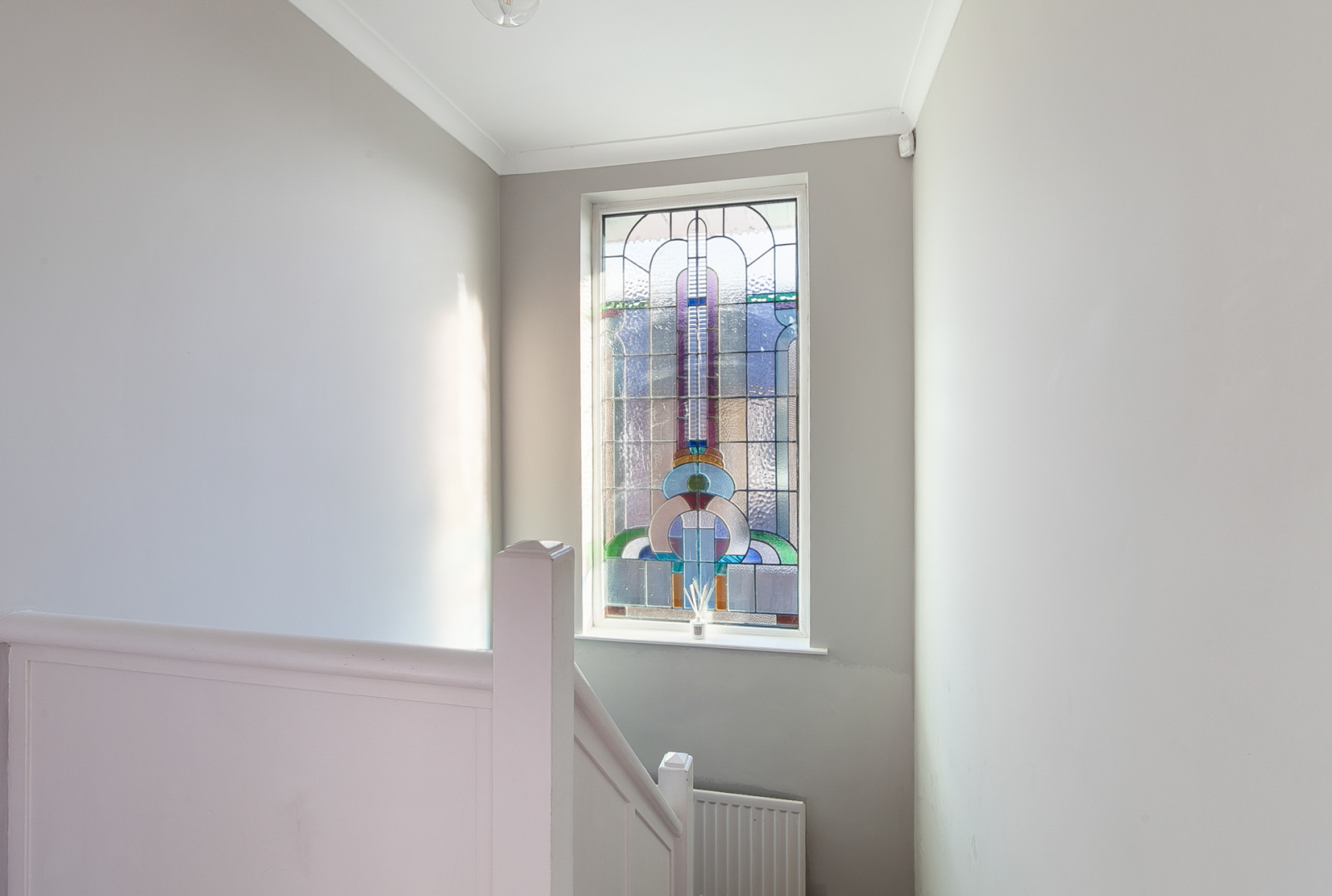 The first floor is centred around a truly impressive feature stained-glass window, filling the landing with colour and character. There is also access to the loft.