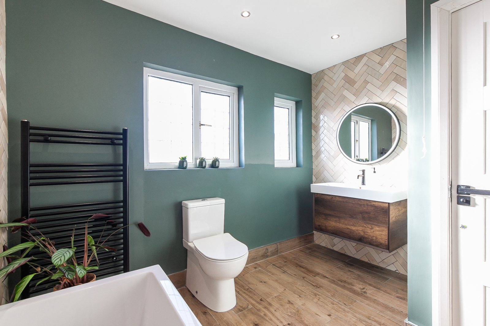 Contemporary bathroom suite comprising of paneled bath with overhead shower and shower screen. Low flush WC, feature wall, mounted ceramic bowl sink unit with vanity storage underneath and mixer tap. Heated towel rail, partly tiled walls, tiled floor, recessed lighting and extractor fan.