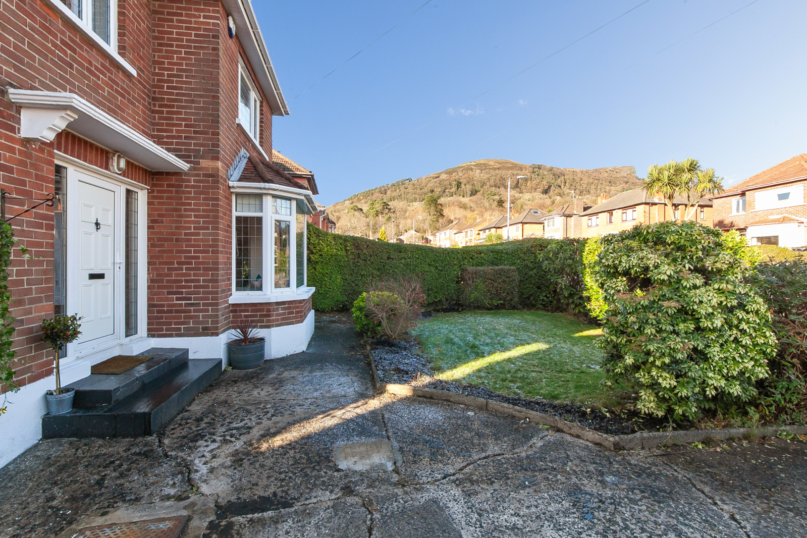 Off street driveway parking for up to four cars, access to garage , front garden laid in grass, shrubbery and hedges and views over Cavehill.