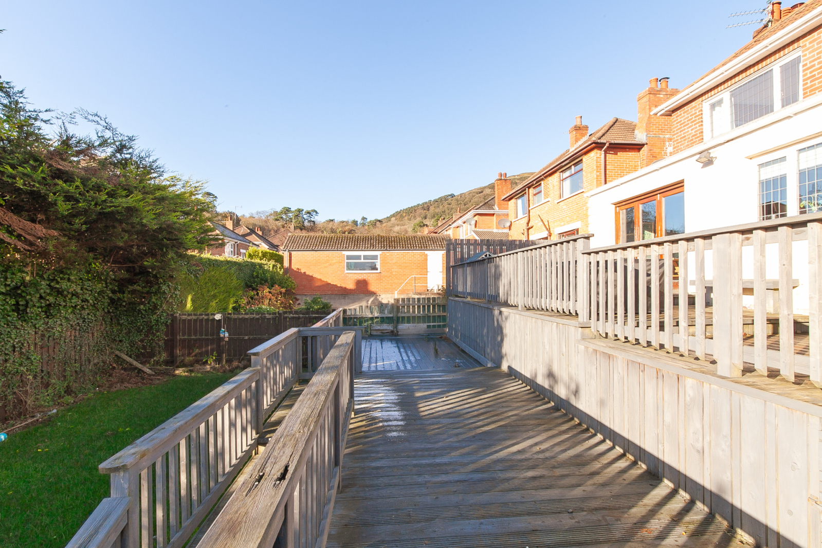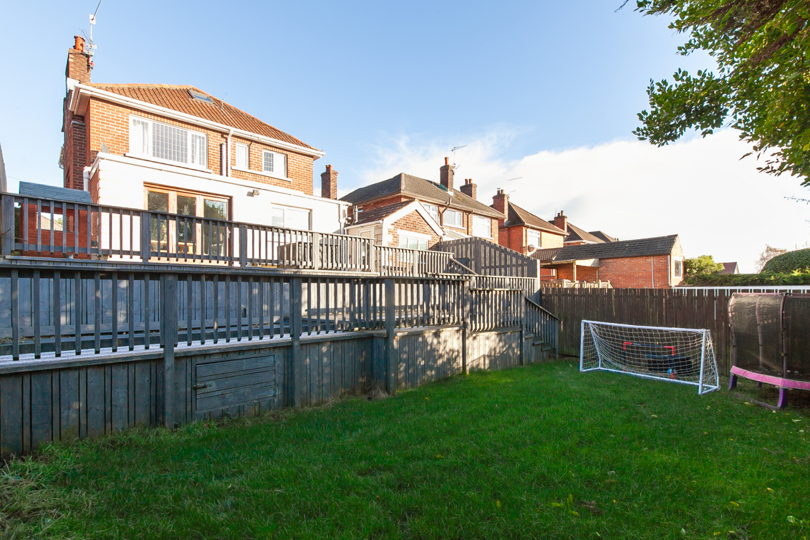 Enclosed South facing garden with raised decking area with storage space below and bordering fencing. Rear garden laid in grass with excellent privacy and bin storage space to the side.