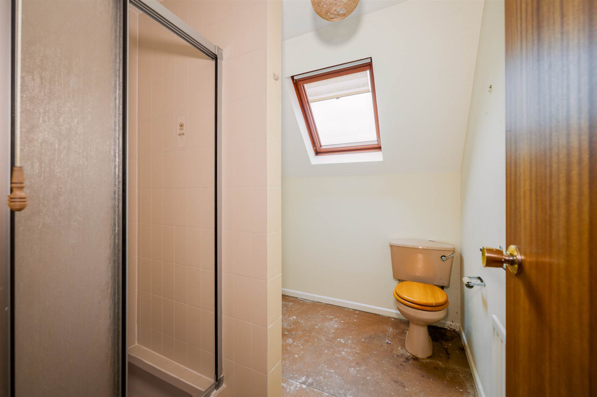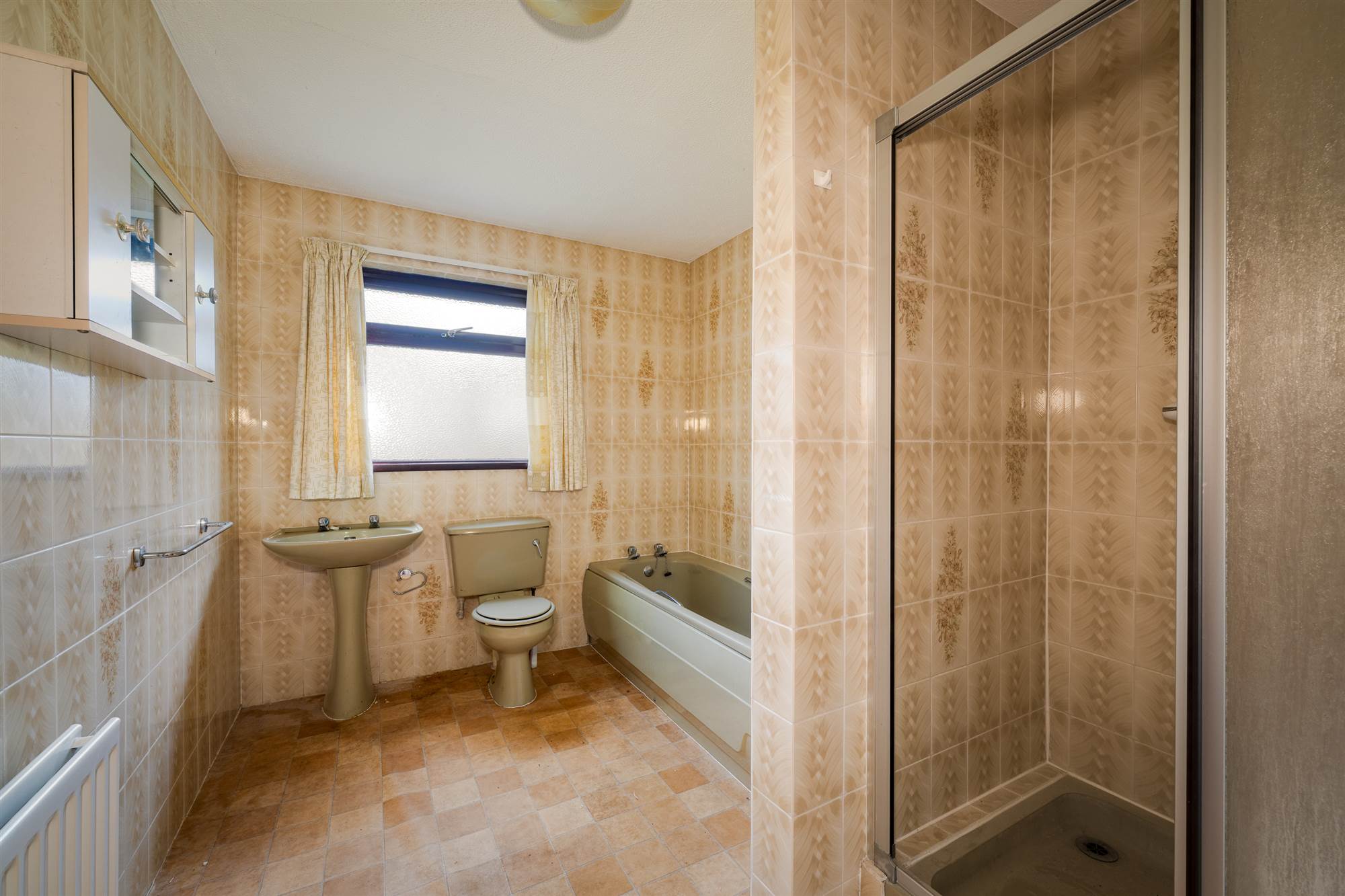 Coloured suite comprising panelled bath, low flush wc, pedestal wash hand basin, separate tiled shower cubicle with Aqualisa shower.