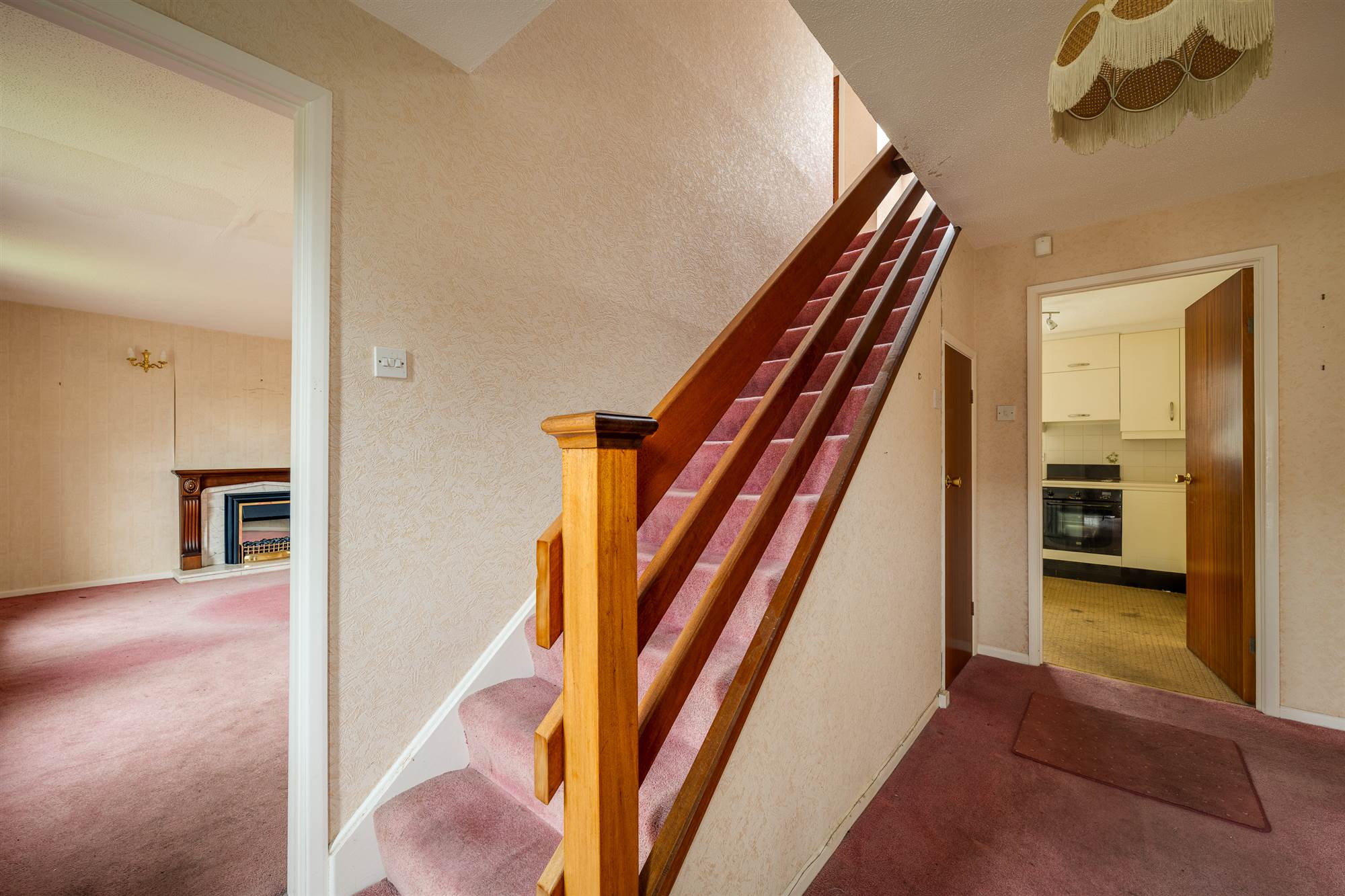 Front garden in lawns with border flower beds. Pedestrian path to front door and leading to side area also in lawns with variety of mature plants and shrubs. Gate to rear garden. Driveway leading to . . .